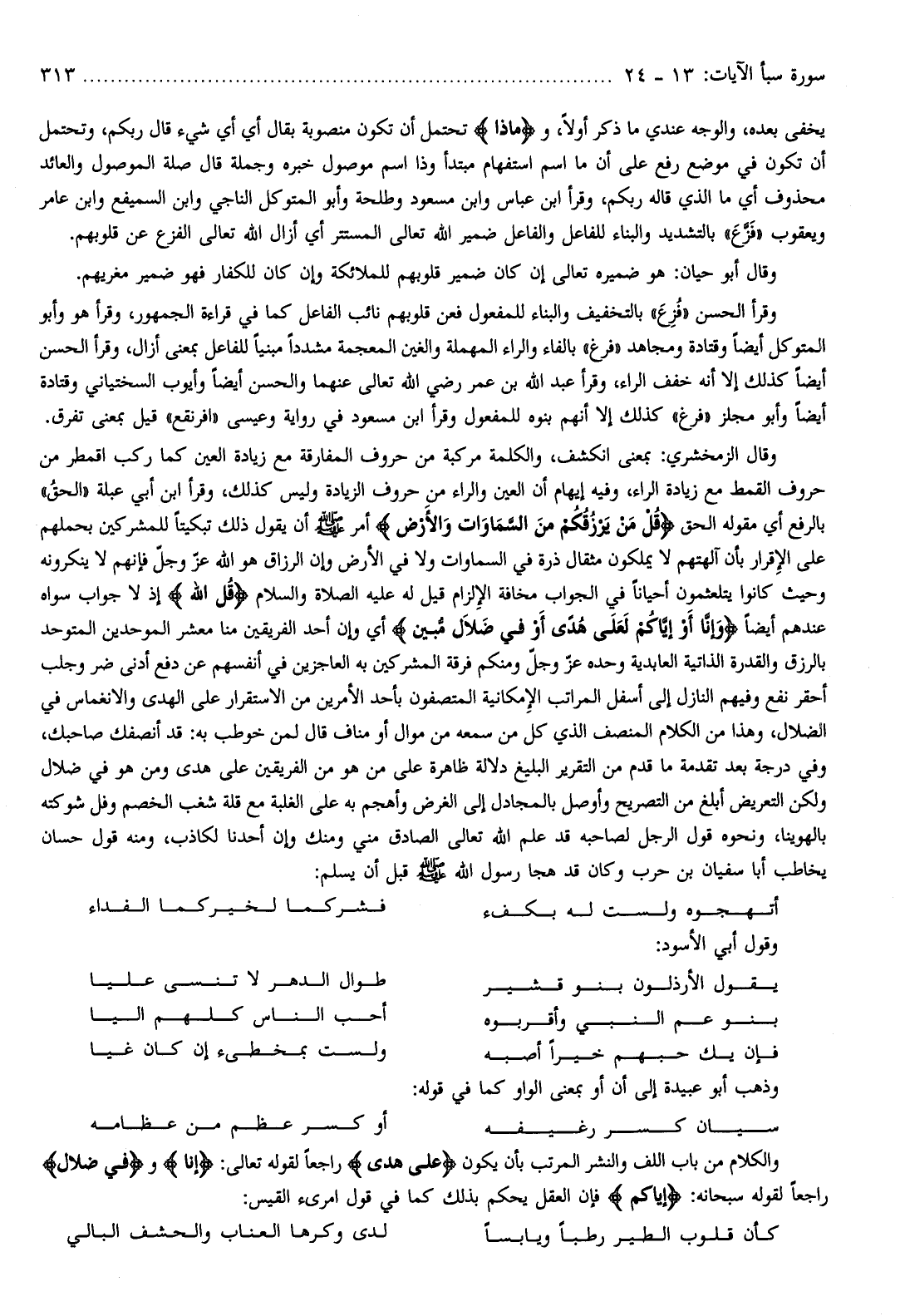 وقال الزمخشري: بمعنى انكشف، والكلمة مركبة من حروف المفارقة مع زيادة العين كما ركب اقمطر من حروف القمط مع زيادة الراء، وفيه إيهام أن العين والراء من حروف الزيادة وليس كذلك، وقرأ ابن أبي عبلة «الحق» بالرفع أي مقوله الحق قُلْ مَنْ يَرْزُقُكُمْ مِنَ السَّماواتِ وَالْأَرْضِ أمر صلّى الله عليه وسلم أن يقول ذلك تبكيتا للمشركين بحملهم على الإقرار بأن آلهتهم لا يملكون مثقال ذرة في السماوات ولا في الأرض وإن الرزاق هو الله عزّ وجلّ فإنهم لا ينكرونه وحيث كانوا يتلعثمون أحيانا في الجواب مخافة الإلزام قيل له عليه الصلاة والسّلام قُلِ اللَّهُ إذ لا جواب سواه عندهم أيضا وَإِنَّا أَوْ إِيَّاكُمْ لَعَلى هُدىً أَوْ فِي ضَلالٍ مُبِينٍ أي وإن أحد الفريقين منا معشر الموحدين المتوحد بالرزق والقدرة الذاتية العابدية وحده عزّ وجلّ ومنكم فرقة المشركين به العاجزين في أنفسهم عن دفع أدنى ضر وجلب أحقر نفع وفيهم النازل إلى أسفل المراتب الإمكانية المتصفون بأحد الأمرين من الاستقرار على الهدى والانغماس في الضلال، وهذا من الكلام المنصف الذي كل من سمعه من موال أو مناف قال لمن خوطب به: قد أنصفك صاحبك، وفي درجة بعد تقدمة ما قدم من التقرير البليغ دلالة ظاهرة على من هو من الفريقين على هدى ومن هو في ضلال ولكن التعريض أبلغ من التصريح وأوصل بالمجادل إلى الغرض وأهجم به على الغلبة مع قلة شغب الخصم وفل شوكته بالهوينا، ونحوه قول الرجل لصاحبه قد علم الله تعالى الصادق مني ومنك وإن أحدنا لكاذب، ومنه قول حسان يخاطب أبا سفيان بن حرب وكان قد هجا رسول الله صلّى الله عليه وسلم قبل أن يسلم:
