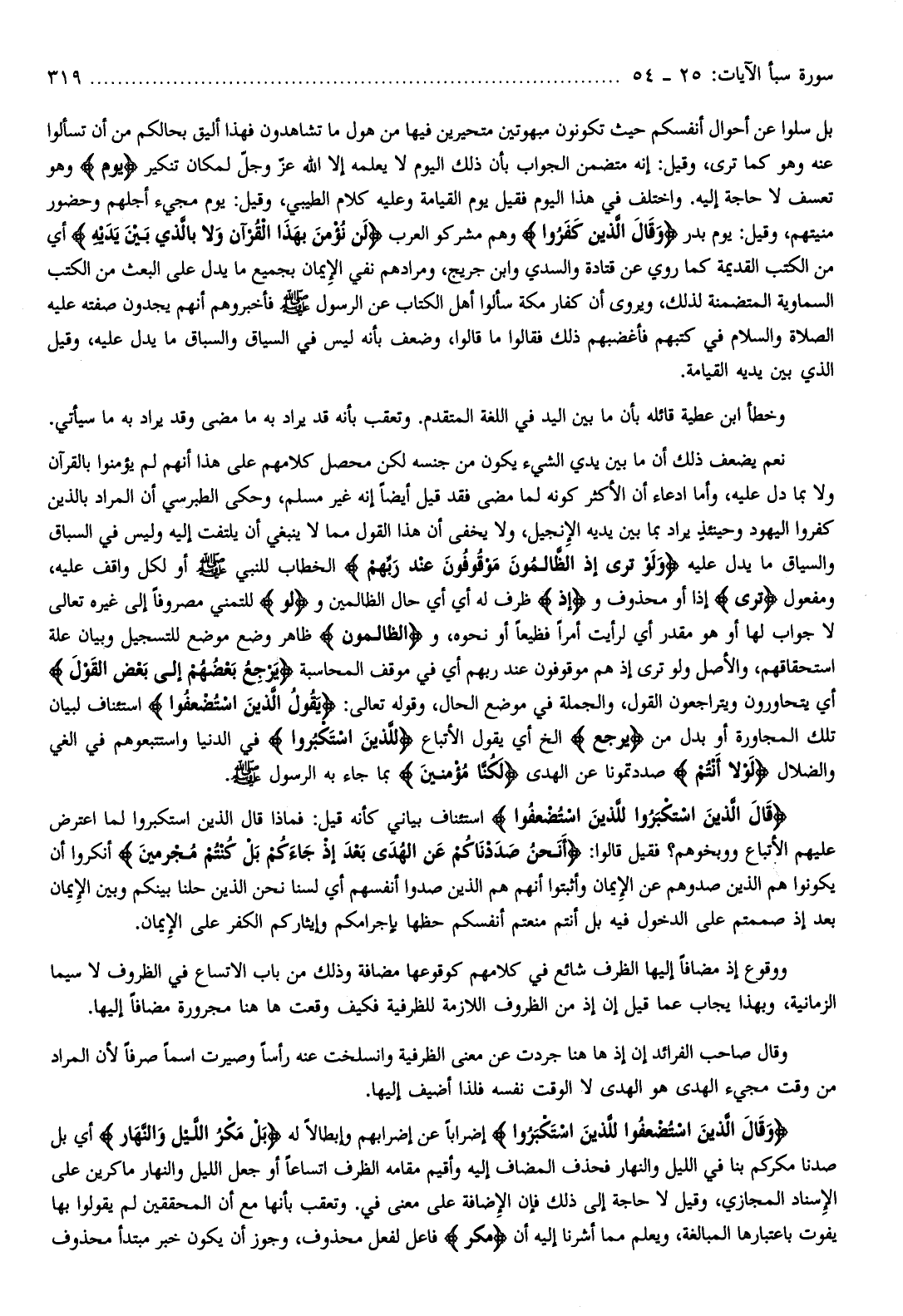 نعم يضعف ذلك أن ما بين يدي الشيء يكون من جنسه لكن محصل كلامهم على هذا أنهم لم يؤمنوا بالقرآن ولا بما دل عليه، وأما ادعاء أن الأكثر كونه لما مضى فقد قيل أيضا إنه غير مسلم، وحكى الطبرسي أن المراد بالذين كفروا اليهود وحينئذ يراد بما بين يديه الإنجيل، ولا يخفى أن هذا القول مما لا ينبغي أن يلتفت إليه وليس في السباق والسياق ما يدل عليه وَلَوْ تَرى إِذِ الظَّالِمُونَ مَوْقُوفُونَ عِنْدَ رَبِّهِمْ الخطاب للنبي صلّى الله عليه وسلم أو لكل واقف عليه، ومفعول تَرى إذا أو محذوف وإِذِ ظرف له أي أي حال الظالمين ولَوْ للتمني مصروفا إلى غيره تعالى لا جواب لها أو هو مقدر أي لرأيت أمرا فظيعا أو نحوه، والظَّالِمُونَ ظاهر وضع موضع للتسجيل وبيان علة استحقاقهم، والأصل ولو ترى إذ هم موقوفون عند ربهم أي في موقف المحاسبة يَرْجِعُ بَعْضُهُمْ إِلى بَعْضٍ الْقَوْلَ أي يتحاورون ويتراجعون القول، والجملة في موضع الحال، وقوله تعالى: يَقُولُ الَّذِينَ اسْتُضْعِفُوا استئناف لبيان تلك المجاورة أو بدل من يَرْجِعُ إلخ أي يقول الأتباع لِلَّذِينَ اسْتَكْبَرُوا في الدنيا واستتبعوهم في الغي والضلال لَوْلا أَنْتُمْ صددتمونا عن الهدى لَكُنَّا مُؤْمِنِينَ بما جاء به الرسول صلّى الله عليه وسلم.