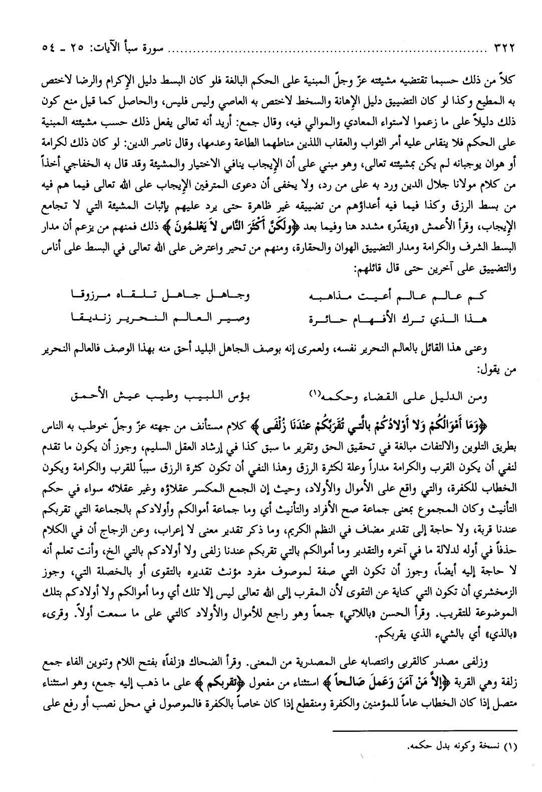 وَما أَمْوالُكُمْ وَلا أَوْلادُكُمْ بِالَّتِي تُقَرِّبُكُمْ عِنْدَنا زُلْفى كلام مستأنف من جهته عزّ وجلّ خوطب به الناس بطريق التلوين والالتفات مبالغة في تحقيق الحق وتقرير ما سبق كذا في إرشاد العقل السليم، وجوز أن يكون ما تقدم لنفي أن يكون القرب والكرامة مدارا وعلة لكثرة الرزق وهذا النفي أن تكون كثرة الرزق سببا للقرب والكرامة ويكون الخطاب للكفرة، والتي واقع على الأموال والأولاد، وحيث إن الجمع المكسر عقلاؤه وغير عقلائه سواء في حكم التأنيث وكان المجموع بمعنى جماعة صح الأفراد والتأنيث أي وما جماعة أموالكم وأولادكم بالجماعة التي تقربكم عندنا قربة، ولا حاجة إلى تقدير مضاف في النظم الكريم، وما ذكر تقدير معنى لا إعراب، وعن الزجاج أن في الكلام حذفا في أوله لدلالة ما في آخره والتقدير وما أموالكم بالتي تقربكم عندنا زلفى ولا أولادكم بالتي إلخ، وأنت تعلم أنه لا حاجة إليه أيضا، وجوز أن تكون التي صفة لموصوف مفرد مؤنث تقديره بالتقوى أو بالخصلة التي، وجوز الزمخشري أن تكون التي كناية عن التقوى لأن المقرب إلى الله تعالى ليس إلا تلك أي وما أموالكم ولا أولادكم بتلك الموضوعة للتقريب. وقرأ الحسن «باللاتي» جمعا وهو راجع للأموال والأولاد كالتي على ما سمعت أولا. وقرىء «بالذي» أي بالشيء الذي يقربكم.