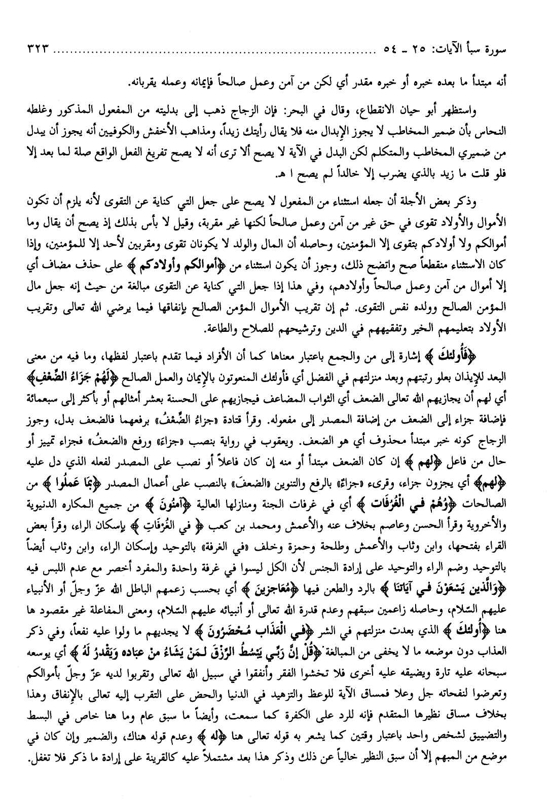 فَأُولئِكَ إشارة إلى من والجمع باعتبار معناها كما أن الأفراد فيما تقدم باعتبار لفظها، وما فيه من معنى البعد للإيذان بعلو رتبتهم وبعد منزلتهم في الفضل أي فأولئك المنعوتون بالإيمان والعمل الصالح لَهُمْ جَزاءُ الضِّعْفِ أي لهم أن يجازيهم الله تعالى الضعف أي الثواب المضاعف فيجازيهم على الحسنة بعشر أمثالهم أو بأكثر إلى سبعمائة فإضافة جزاء إلى الضعف من إضافة المصدر إلى مفعوله. وقرأ قتادة «جزاء الضّعف» برفعهما فالضعف بدل، وجوز الزجاج كونه خبر مبتدأ محذوف أي هو الضعف. ويعقوب في رواية بنصب «جزاء» ورفع «الضعف» فجزاء تمييز أو حال من فاعل لَهُمْ إن كان الضعف مبتدأ أو منه إن كان فاعلا أو نصب على المصدر لفعله الذي دل عليه لَهُمْ أي يجزون جزاء، وقرىء «جزاء» بالرفع والتنوين «الضعف» بالنصب على أعمال المصدر بِما عَمِلُوا من الصالحات وَهُمْ فِي الْغُرُفاتِ أي في غرفات الجنة ومنازلها العالية آمِنُونَ من جميع المكاره الدنيوية والأخروية وقرأ الحسن وعاصم بخلاف عنه والأعمش ومحمد بن كعب فِي الْغُرُفاتِ بإسكان الراء، وقرأ بعض القراء بفتحها، وابن وثاب والأعمش وطلحة وحمزة وخلف «في الغرفة» بالتوحيد وإسكان الراء، وابن وثاب أيضا بالتوحيد وضم الراء والتوحيد على إرادة الجنس لأن الكل ليسوا في غرفة واحدة والمفرد أخصر مع عدم اللبس فيه وَالَّذِينَ يَسْعَوْنَ فِي آياتِنا بالرد والطعن فيها مُعاجِزِينَ أي بحسب زعمهم الباطل الله عزّ وجلّ أو الأنبياء عليهم السّلام، وحاصله زاعمين سبقهم وعدم قدرة الله تعالى أو أنبيائه عليهم السّلام، ومعنى المفاعلة غير مقصود هاهنا أُولئِكَ الذي بعدت منزلتهم في الشر فِي الْعَذابِ مُحْضَرُونَ لا يجديهم ما ولوا عليه نفعا، وفي ذكر العذاب دون موضعه ما لا يخفى من المبالغة قُلْ إِنَّ رَبِّي يَبْسُطُ الرِّزْقَ لِمَنْ يَشاءُ مِنْ عِبادِهِ وَيَقْدِرُ لَهُ أي يوسعه سبحانه عليه تارة ويضيقه عليه أخرى فلا تخشوا الفقر وأنفقوا في سبيل الله تعالى وتقربوا لديه عزّ وجلّ بأموالكم وتعرضوا لنفحاته جل وعلا فمساق الآية للوعظ والتزهيد في الدنيا والحض على التقرب إليه تعالى بالإنفاق وهذا بخلاف مساق نظيرها المتقدم فإنه للرد على الكفرة كما سمعت، وأيضا ما سبق عام وما هنا خاص في البسط والتضييق لشخص واحد باعتبار وقتين كما يشعر به قوله تعالى هنا لَهُ وعدم قوله هناك، والضمير وإن كان في موضع من المبهم إلا أن سبق النظير خاليا عن ذلك وذكر هذا بعد مشتملا عليه كالقرينة على إرادة ما ذكر فلا تغفل.