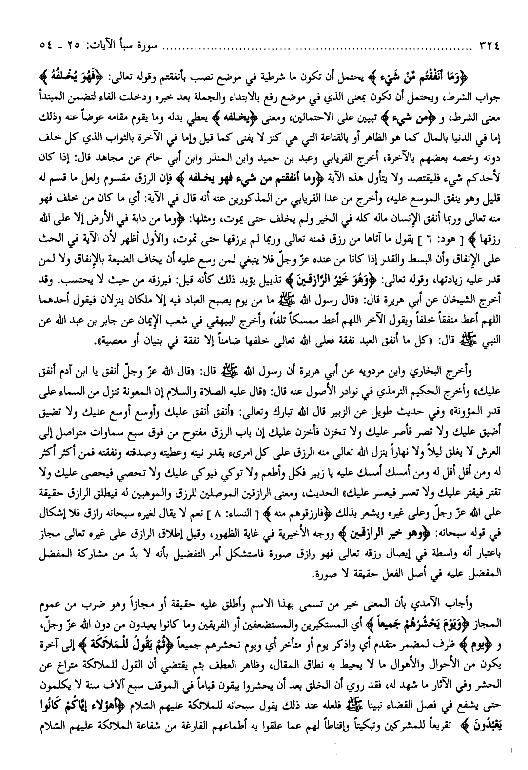 وَما أَنْفَقْتُمْ مِنْ شَيْءٍ يحتمل أن تكون ما شرطية في موضع نصب بأنفقتم وقوله تعالى: فَهُوَ يُخْلِفُهُ جواب الشرط، ويحتمل أن تكون بمعنى الذي في موضع رفع بالابتداء والجملة بعد خبره ودخلت الفاء لتضمن المبتدأ معنى الشرط، ومِنْ شَيْءٍ تبيين على الاحتمالين، ومعنى يُخْلِفُهُ يعطي بدله وما يقوم مقامه عوضا عنه وذلك إما في الدنيا بالمال كما هو الظاهر أو بالقناعة التي هي كنز لا يفنى كما قيل وإما في الآخرة بالثواب الذي كل خلف دونه وخصه بعضهم بالآخرة، أخرج الفريابي وعبد بن حميد وابن المنذر وابن أبي حاتم عن مجاهد قال: إذا كان لأحدكم شيء فليقتصد ولا يتأول هذه الآية وَما أَنْفَقْتُمْ مِنْ شَيْءٍ فَهُوَ يُخْلِفُهُ فإن الرزق مقسوم ولعل ما قسم له قليل وهو ينفق الموسع عليه، وأخرج من عدا الفريابي من المذكورين عنه أنه قال في الآية: أي ما كان من خلف فهو منه تعالى وربما أنفق الإنسان ماله كله في الخير ولم يخلف حتى يموت، ومثلها: وَما مِنْ دَابَّةٍ فِي الْأَرْضِ إِلَّا عَلَى اللَّهِ رِزْقُها [هود: 6] يقول ما آتاها من رزق فمنه تعالى وربما لم يرزقها حتى تموت، والأول أظهر لأن الآية في الحث على الإنفاق وأن البسط والقدر إذا كانا من عنده عزّ وجلّ فلا ينبغي لمن وسع عليه أن يخاف الضيعة بالإنفاق ولا لمن قدر عليه زيادتها، وقوله تعالى: وَهُوَ خَيْرُ الرَّازِقِينَ تذييل يؤيد ذلك كأنه قيل: فيرزقه من حيث لا يحتسب.