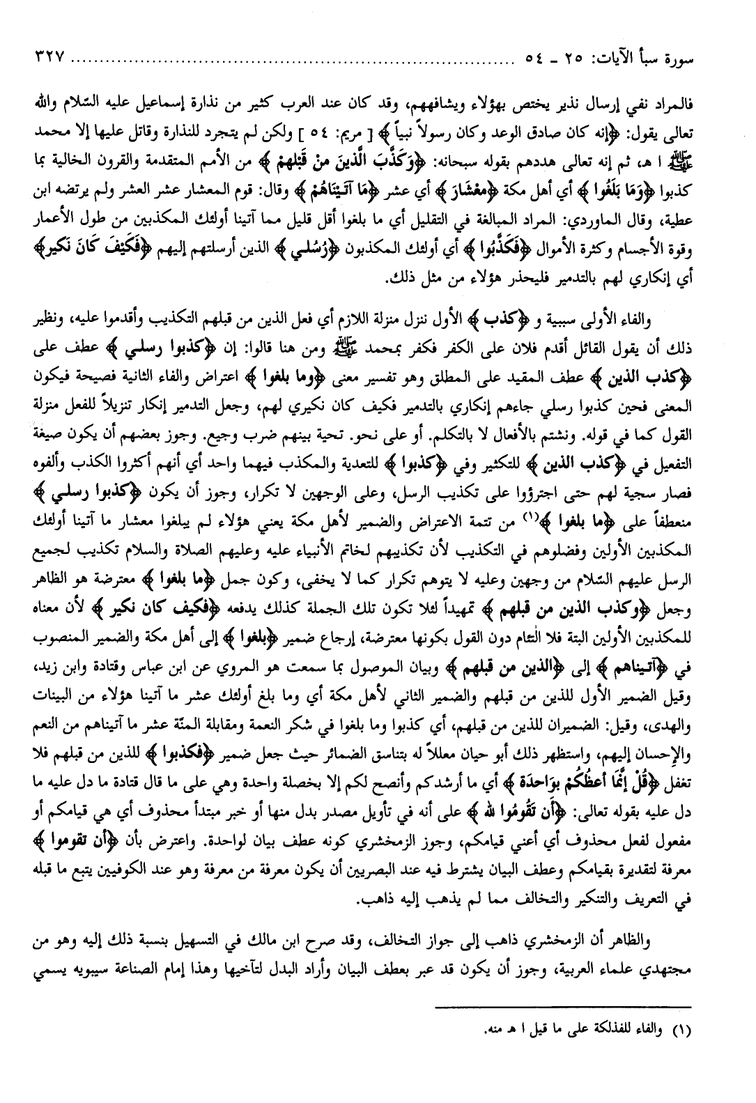 والفاء الأولى سببية وكَذَّبَ الأول ننزل منزلة اللازم أي فعل الذين من قبلهم التكذيب وأقدموا عليه، ونظير ذلك أن يقول القائل أقدم فلان على الكفر فكفر بمحمد صلّى الله عليه وسلم ومن هنا قالوا: إن كذبوا رُسُلِي عطف على كَذَّبَ الَّذِينَ عطف المقيد على المطلق وهو تفسير معنى وَما بَلَغُوا اعتراض والفاء الثانية فصيحة فيكون المعنى فحين كذبوا رسلي جاءهم إنكاري بالتدمير فكيف كان نكيري لهم، وجعل التدمير إنكار تنزيلا للفعل منزلة القول كما في قوله. ونشتم بالأفعال لا بالتكلم. أو على نحو. تحية بينهم ضرب وجيع. وجوز بعضهم أن يكون صيغة التفعيل في كَذَّبَ الَّذِينَ للتكثير وفي (كذبوا) للتعدية والمكذب فيهما واحد أي أنهم أكثروا الكذب وألفوه فصار سجية لهم حتى اجترءوا على تكذيب الرسل، وعلى الوجهين لا تكرار، وجوز أن يكون كذبوا رُسُلِي منعطفا على ما بَلَغُوا (¬1) من تتمة الاعتراض والضمير لأهل مكة يعني هؤلاء لم يبلغوا معشار ما آتينا أولئك المكذبين الأولين وفضلوهم في التكذيب لأن تكذيبهم لخاتم الأنبياء عليه وعليهم الصلاة والسلام تكذيب لجميع الرسل عليهم السّلام من وجهين وعليه لا يتوهم تكرار كما لا يخفى، وكون جمل ما بَلَغُوا معترضة هو الظاهر وجعل وَكَذَّبَ الَّذِينَ مِنْ قَبْلِهِمْ تمهيدا لئلا تكون تلك الجملة كذلك يدفعه فَكَيْفَ كانَ نَكِيرِ لأن معناه للمكذبين الأولين البتة فلا التئام دون القول بكونها معترضة، إرجاع ضمير بَلَغُوا إلى أهل مكة والضمير المنصوب في آتَيْناهُمْ إلى الَّذِينَ مِنْ قَبْلِهِمْ وبيان الموصول بما سمعت هو المروي عن ابن عباس وقتادة وابن زيد، وقيل الضمير الأول للذين من قبلهم والضمير الثاني لأهل مكة أي وما بلغ أولئك عشر ما آتينا هؤلاء من البينات والهدى، وقيل: الضميران للذين من قبلهم، أي كذبوا وما بلغوا في شكر النعمة ومقابلة المنّة عشر ما آتيناهم من النعم والإحسان إليهم، واستظهر ذلك أبو حيان معللا له بتناسق الضمائر حيث جعل ضمير فَكَذَّبُوا للذين من قبلهم فلا تغفل قُلْ إِنَّما أَعِظُكُمْ بِواحِدَةٍ أي ما أرشدكم وأنصح لكم إلا بخصلة واحدة وهي على ما قال قتادة ما دل عليه ما دل عليه بقوله تعالى: أَنْ تَقُومُوا لِلَّهِ على أنه في تأويل مصدر بدل منها أو خبر مبتدأ محذوف أي هي قيامكم أو مفعول لفعل محذوف أي أعني قيامكم، وجوز الزمخشري كونه عطف بيان لواحدة. واعترض بأن أَنْ تَقُومُوا معرفة لتقديره بقيامكم وعطف البيان يشترط فيه عند البصريين أن يكون معرفة من معرفة وهو عند الكوفيين يتبع ما قبله في التعريف والتنكير والتخالف مما لم يذهب إليه ذاهب.