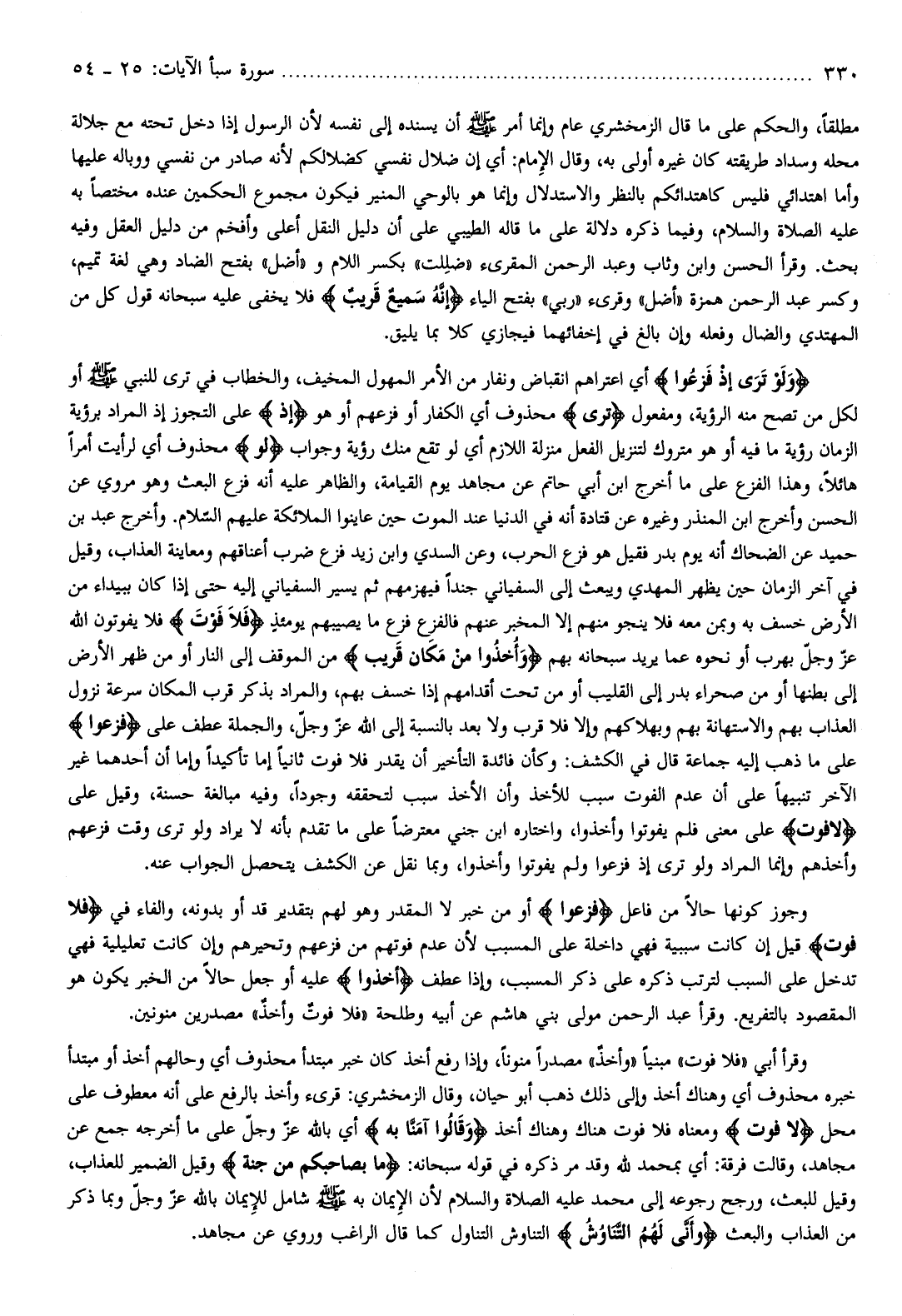 وَلَوْ تَرى إِذْ فَزِعُوا أي اعتراهم انقباض ونفار من الأمر المهول المخيف، والخطاب في ترى للنبي صلّى الله عليه وسلم أو لكل من تصح منه الرؤية، ومفعول تَرى محذوف أي الكفار أو فزعهم أو هو إِذْ على التجوز إذ المراد برؤية الزمان رؤية ما فيه أو هو متروك لتنزيل الفعل منزلة اللازم أي لو تقع منك رؤية وجواب لَوْ محذوف أي لرأيت أمرا هائلا، وهذا الفزع على ما أخرج ابن أبي حاتم عن مجاهد يوم القيامة، والظاهر عليه أنه فزع البعث وهو مروي عن الحسن وأخرج ابن المنذر وغيره عن قتادة أنه في الدنيا عند الموت حين عاينوا الملائكة عليهم السّلام. وأخرج عبد بن حميد عن الضحاك أنه يوم بدر فقيل هو فزع الحرب، وعن السدي وابن زيد فزع ضرب أعناقهم ومعاينة العذاب، وقيل في آخر الزمان حين يظهر المهدي ويبعث إلى السفياني جندا فيهزمهم ثم يسير السفياني إليه حتى إذا كان ببيداء من الأرض خسف به وبمن معه فلا ينجو منهم إلا المخبر عنهم فالفزع فزع ما يصيبهم يومئذ فَلا فَوْتَ فلا يفوتون الله عزّ وجلّ بهرب أو نحوه عما يريد سبحانه بهم وَأُخِذُوا مِنْ مَكانٍ قَرِيبٍ من الموقف إلى النار أو من ظهر الأرض إلى بطنها أو من صحراء بدر إلى القليب أو من تحت أقدامهم إذا خسف بهم، والمراد بذكر قرب المكان سرعة نزول العذاب بهم والاستهانة بهم وبهلاكهم وإلا فلا قرب ولا بعد بالنسبة إلى الله عزّ وجلّ، والجملة عطف على فَزِعُوا على ما ذهب إليه جماعة قال في الكشف: وكأن فائدة التأخير أن يقدر فلا فوت ثانيا إما تأكيدا وإما أن أحدهما غير الآخر تنبيها على أن عدم الفوت سبب للأخذ وأن الأخذ سبب لتحققه وجودا، وفيه مبالغة حسنة، وقيل على لا فَوْتَ على معنى فلم يفوتوا وأخذوا، واختاره ابن جني معترضا على ما تقدم بأنه لا يراد ولو ترى وقت فزعهم وأخذهم وإنما المراد ولو ترى إذ فزعوا ولم يفوتوا وأخذوا، وبما نقل عن الكشف يتحصل الجواب عنه.
