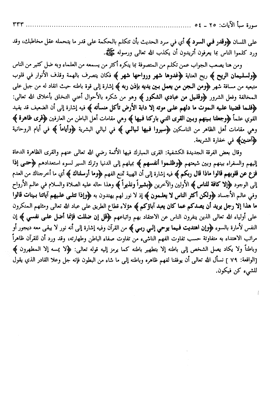 ومن هنا يصعب الجواب عمن تكلم من المتصوفة بما ينكره أكثر من يسمعه من العلماء وبه ضل كثير من الناس وَلِسُلَيْمانَ الرِّيحَ ريح العناية غُدُوُّها شَهْرٌ وَرَواحُها شَهْرٌ فكان يتصرف بالهمة وقذف الأنوار في قلوب متبعيه من مسافة شهر وَمِنَ الْجِنِّ مَنْ يَعْمَلُ بَيْنَ يَدَيْهِ بِإِذْنِ رَبِّهِ إشارة إلى قوة باطنه حيث انقاد له من جبل على المخالفة وفعل الشرور وَقَلِيلٌ مِنْ عِبادِيَ الشَّكُورُ وهو من شكره بالأحوال أعني التخلق بأخلاق الله تعالى: