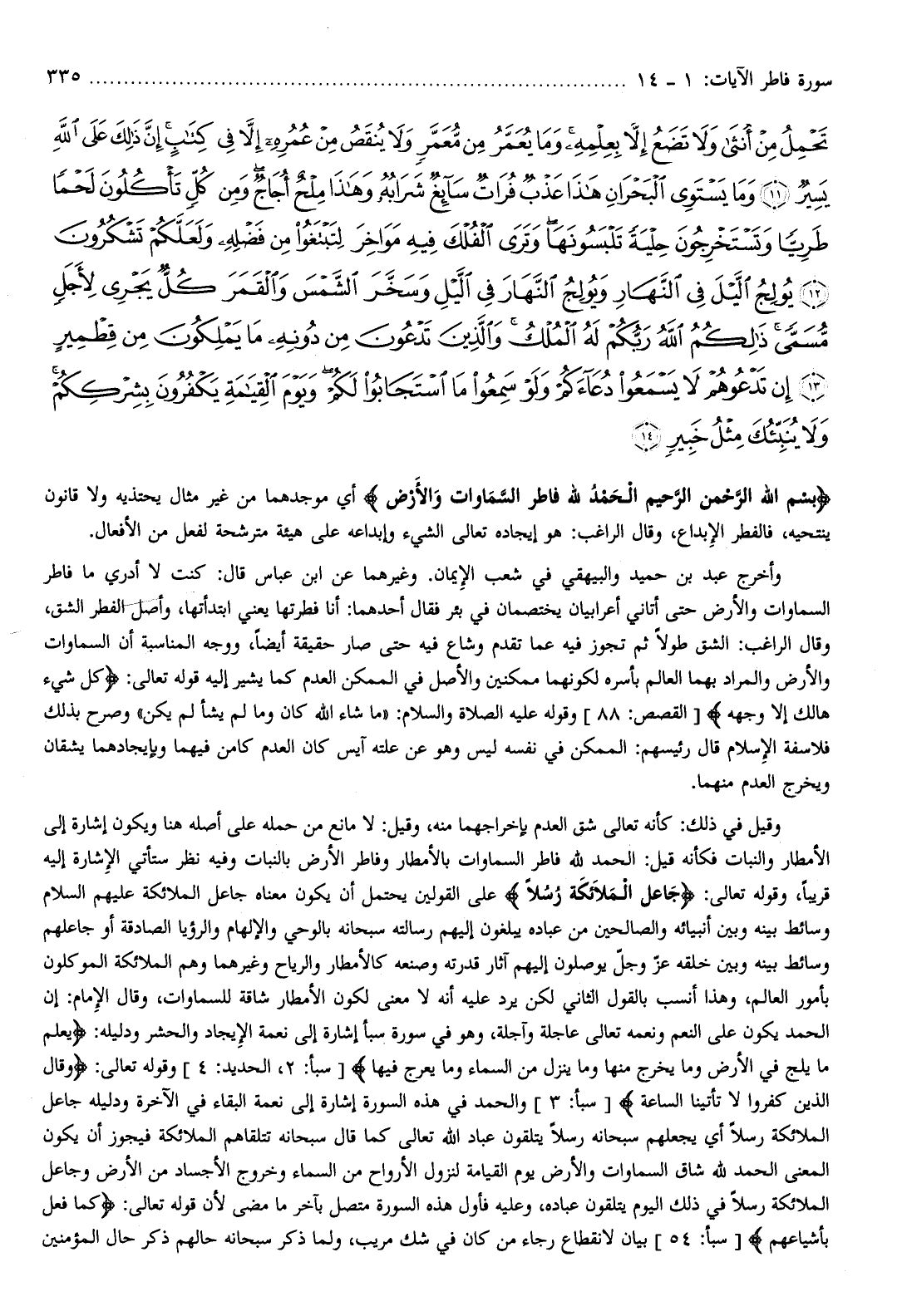 بِسْمِ اللَّهِ الرَّحْمنِ الرَّحِيمِ الْحَمْدُ لِلَّهِ فاطِرِ السَّماواتِ وَالْأَرْضِ أي موجدهما من غير مثال يحتذيه ولا قانون ينتحيه، فالفطر الإبداع، وقال الراغب: هو إيجاده تعالى الشيء وإبداعه على هيئة مترشحة لفعل من الأفعال.