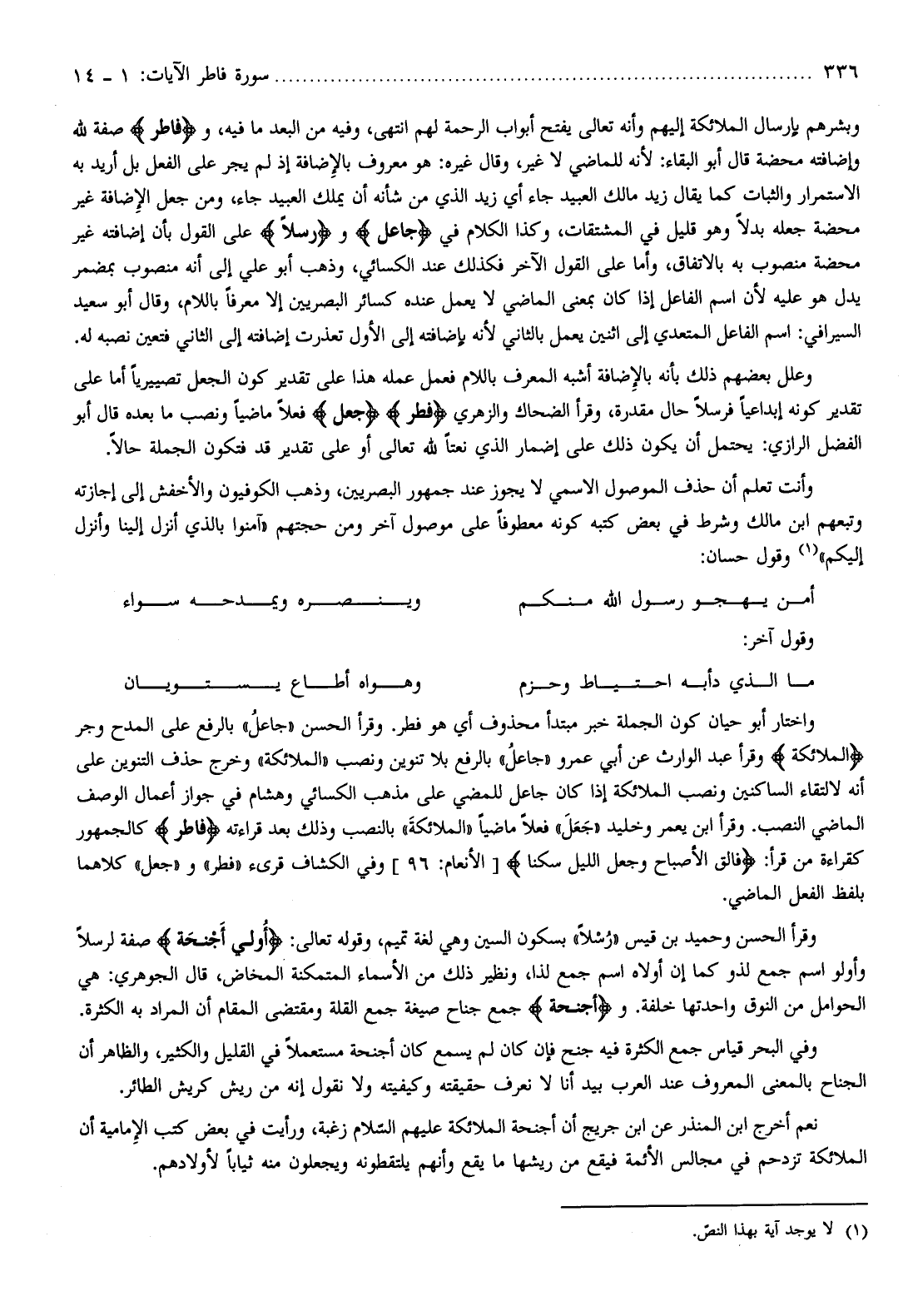 وقرأ الحسن وحميد بن قيس «رسلا» بسكون السين وهي لغة تميم، وقوله تعالى: أُولِي أَجْنِحَةٍ صفة لرسلا وأولو اسم جمع لذو كما إن أولاه اسم جمع لذا، ونظير ذلك من الأسماء المتمكنة المخاض، قال الجوهري: هي الحوامل من النوق واحدتها خلفة. وأَجْنِحَةٍ جمع جناح صيغة جمع القلة ومقتضى المقام أن المراد به الكثرة.