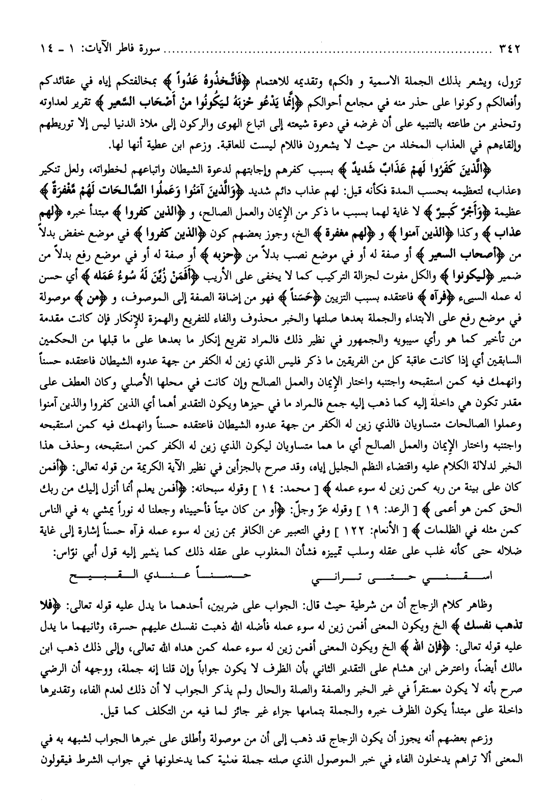 الَّذِينَ كَفَرُوا لَهُمْ عَذابٌ شَدِيدٌ بسبب كفرهم وإجابتهم لدعوة الشيطان واتباعهم لخطواته، ولعل تنكير «عذاب» لتعظيمه بحسب المدة فكأنه قيل: لهم عذاب دائم شديد وَالَّذِينَ آمَنُوا وَعَمِلُوا الصَّالِحاتِ لَهُمْ مَغْفِرَةٌ عظيمة وَأَجْرٌ كَبِيرٌ لا غاية لهما بسبب ما ذكر من الإيمان والعمل الصالح، والَّذِينَ كَفَرُوا مبتدأ خبره لَهُمْ عَذابٌ وكذا الَّذِينَ آمَنُوا ولَهُمْ مَغْفِرَةٌ إلخ، وجوز بعضهم كون الَّذِينَ كَفَرُوا في موضع خفض بدلا من أَصْحابِ السَّعِيرِ أو صفة له أو في موضع نصب بدلا من حِزْبَهُ أو صفة له أو في موضع رفع بدلا من ضمير لِيَكُونُوا والكل مفوت لجزالة التركيب كما لا يخفى على الأريب أَفَمَنْ زُيِّنَ لَهُ سُوءُ عَمَلِهِ أي حسن له عمله السيّء فَرَآهُ فاعتقده بسبب التزيين حَسَناً فهو من إضافة الصفة إلى الموصوف، ومَنْ موصولة في موضع رفع على الابتداء والجملة بعدها صلتها والخبر محذوف والفاء للتفريع والهمزة للإنكار فإن كانت مقدمة من تأخير كما هو رأي سيبويه والجمهور في نظير ذلك فالمراد تفريع إنكار ما بعدها على ما قبلها من الحكمين السابقين أي إذا كانت عاقبة كل من الفريقين ما ذكر فليس الذي زين له الكفر من جهة عدوه الشيطان فاعتقده حسنا وانهمك فيه كمن استقبحه واجتنبه واختار الإيمان والعمل الصالح وإن كانت في محلها الأصلي وكان العطف على مقدر تكون هي داخلة إليه كما ذهب إليه جمع فالمراد ما في حيزها ويكون التقدير أهما أي الذين كفروا والذين آمنوا وعملوا الصالحات متساويان فالذي زين له الكفر من جهة عدوه الشيطان فاعتقده حسنا وانهمك فيه كمن استقبحه واجتنبه واختار الإيمان والعمل الصالح أي ما هما متساويان ليكون الذي زين له الكفر كمن استقبحه، وحذف هذا الخبر لدلالة الكلام عليه واقتضاء النظم الجليل إياه، وقد صرح بالجزءين في نظير الآية الكريمة من قوله تعالى: أَفَمَنْ كانَ عَلى بَيِّنَةٍ مِنْ رَبِّهِ كَمَنْ زُيِّنَ لَهُ سُوءُ عَمَلِهِ [محمد: 14] وقوله سبحانه: أَفَمَنْ يَعْلَمُ أَنَّما أُنْزِلَ إِلَيْكَ مِنْ رَبِّكَ الْحَقُّ كَمَنْ هُوَ أَعْمى [الرعد: 19] وقوله عزّ وجلّ: أَوَمَنْ كانَ مَيْتاً فَأَحْيَيْناهُ وَجَعَلْنا لَهُ نُوراً يَمْشِي بِهِ فِي النَّاسِ كَمَنْ مَثَلُهُ فِي الظُّلُماتِ [الأنعام: 122] وفي التعبير عن الكافر بمن زين له سوء عمله فرآه حسنا إشارة إلى غاية ضلاله حتى كأنه غلب على عقله وسلب تمييزه فشأن المغلوب على عقله ذلك كما يشير إليه قول أبي نوّاس: