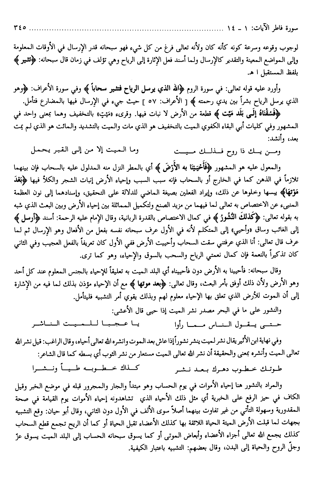 والمعول عليه هو المشهور فَأَحْيَيْنا بِهِ الْأَرْضَ أي بالمطر النزل منه المدلول عليه بالسحاب فإن بينهما تلازما في الذهن كما في الخارج أو بالسحاب فإنه سبب السبب وإحياء الأرض إنبات الشجر والكلأ فيها بَعْدَ مَوْتِها يبسها وخلوها عن ذلك، وإيراد الفعلين بصيغة الماضي للدلالة على التحقيق، وإسنادهما إلى نون العظمة المنبئ عن الاختصاص به تعالى لما فيهما من مزيد الصنع ولتكميل المماثلة بين إحياء الأرض وبين البعث الذي شبه به بقوله تعالى: كَذلِكَ النُّشُورُ في كمال الاختصاص بالقدرة الربانية، وقال الإمام عليه الرحمة: أسند أَرْسَلَ إلى الغائب وساق «وأحيي» إلى المتكلم لأنه في الأول عرف سبحانه نفسه بفعل من الأفعال وهو الإرسال ثم لما عرف قال تعالى: أنا الذي عرفتني سقت السحاب وأحييت الأرض ففي الأول كان تعريفا بالفعل العجيب وفي الثاني كان تذكيرا بالنعمة فإن كمال نعمتي الرياح والسحب بالسوق والإحياء، وهو كما ترى.