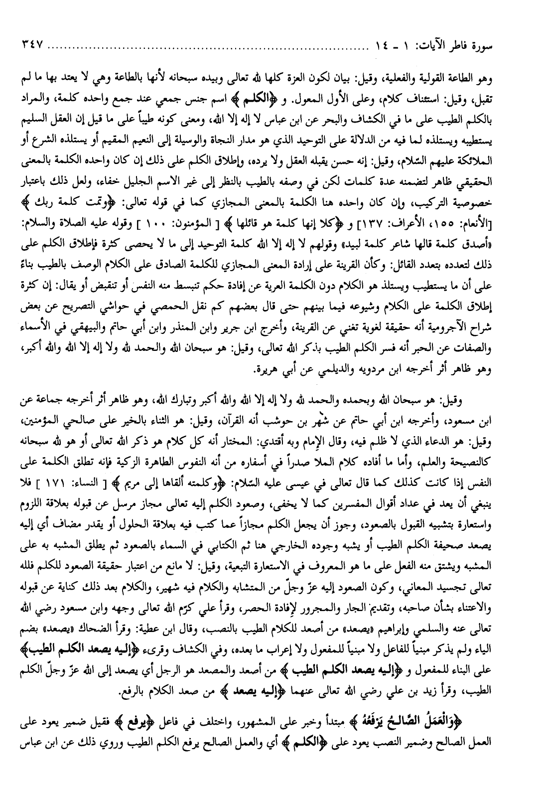 وَالْعَمَلُ الصَّالِحُ يَرْفَعُهُ مبتدأ وخبر على المشهور، واختلف في فاعل (يرفع) فقيل ضمير يعود على العمل الصالح وضمير النصب يعود على الْكَلِمُ أي والعمل الصالح يرفع الكلم الطيب وروي ذلك عن ابن عباس