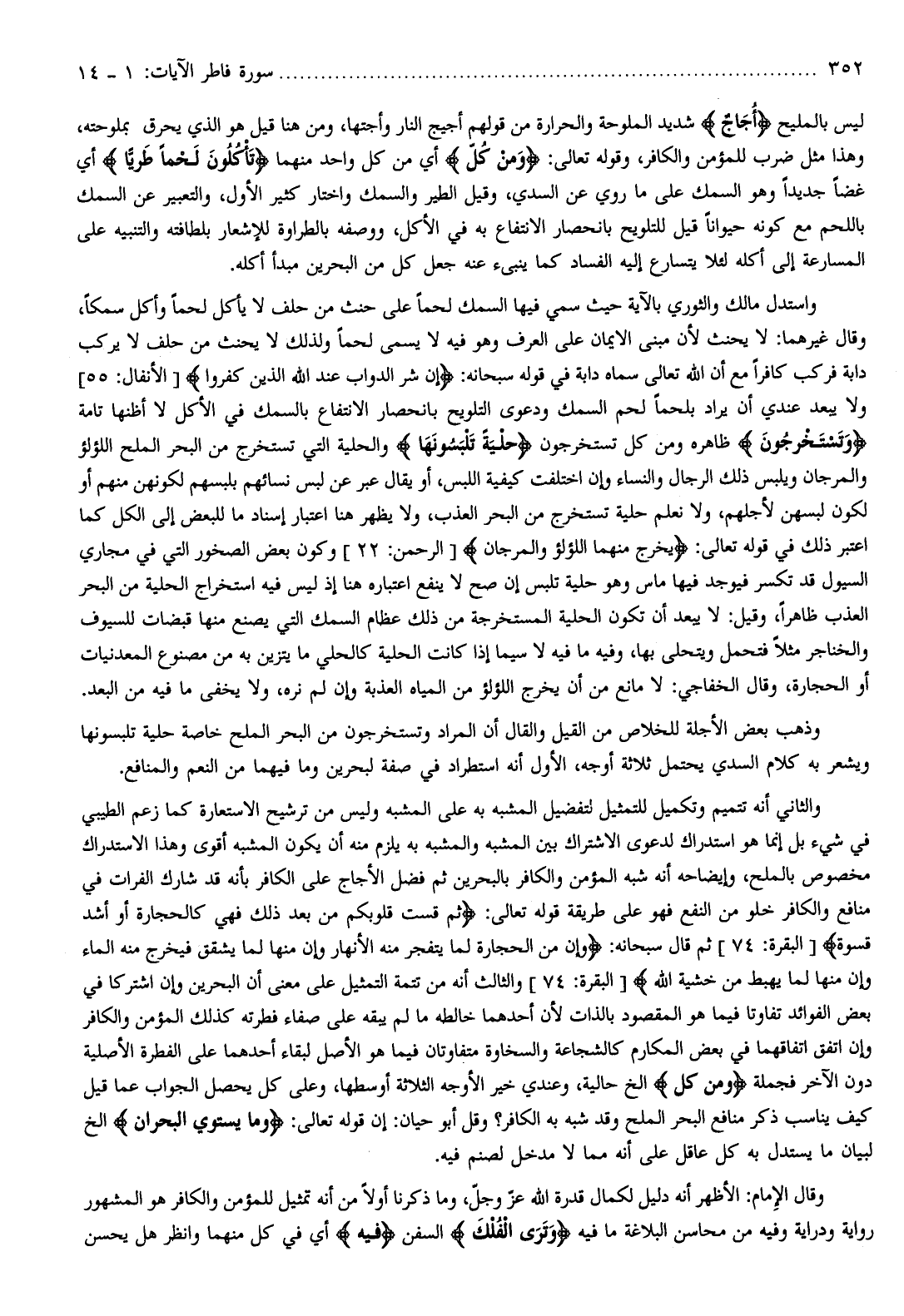 والثاني أنه تتميم وتكميل للتمثيل لتفضيل المشبه به على المشبه وليس من ترشيح الاستعارة كما زعم الطيبي في شيء بل إنما هو استدراك لدعوى الاشتراك بين المشبه والمشبه به يلزم منه أن يكون المشبه أقوى وهذا الاستدراك مخصوص بالملح، وإيضاحه أنه شبه المؤمن والكافر بالبحرين ثم فضل الأجاج على الكافر بأنه قد شارك الفرات في منافع والكافر خلو من النفع فهو على طريقة قوله تعالى: ثُمَّ قَسَتْ قُلُوبُكُمْ مِنْ بَعْدِ ذلِكَ فَهِيَ كَالْحِجارَةِ أَوْ أَشَدُّ قَسْوَةً [البقرة: 74] ثم قال سبحانه: وَإِنَّ مِنَ الْحِجارَةِ لَما يَتَفَجَّرُ مِنْهُ الْأَنْهارُ وَإِنَّ مِنْها لَما يَشَّقَّقُ فَيَخْرُجُ مِنْهُ الْماءُ وَإِنَّ مِنْها لَما يَهْبِطُ مِنْ خَشْيَةِ اللَّهِ [البقرة: 74] والثالث أنه من تتمة التمثيل على معنى أن البحرين وإن اشتركا في بعض الفوائد تفاوتا فيما هو المقصود بالذات لأن أحدهما خالطه ما لم يبقه على صفاء فطرته كذلك المؤمن والكافر وإن اتفق اتفاقهما في بعض المكارم كالشجاعة والسخاوة متفاوتان فيما هو الأصل لبقاء أحدهما على الفطرة الأصلية دون الآخر فجملة وَمِنْ كُلٍّ إلخ حالية، وعندي خير الأوجه الثلاثة أوسطها، وعلى كل يحصل الجواب عما قيل كيف يناسب ذكر منافع البحر الملح وقد شبه به الكافر؟ وقل أبو حيان: إن قوله تعالى: وَما يَسْتَوِي الْبَحْرانِ إلخ لبيان ما يستدل به كل عاقل على أنه مما لا مدخل لصنم فيه.