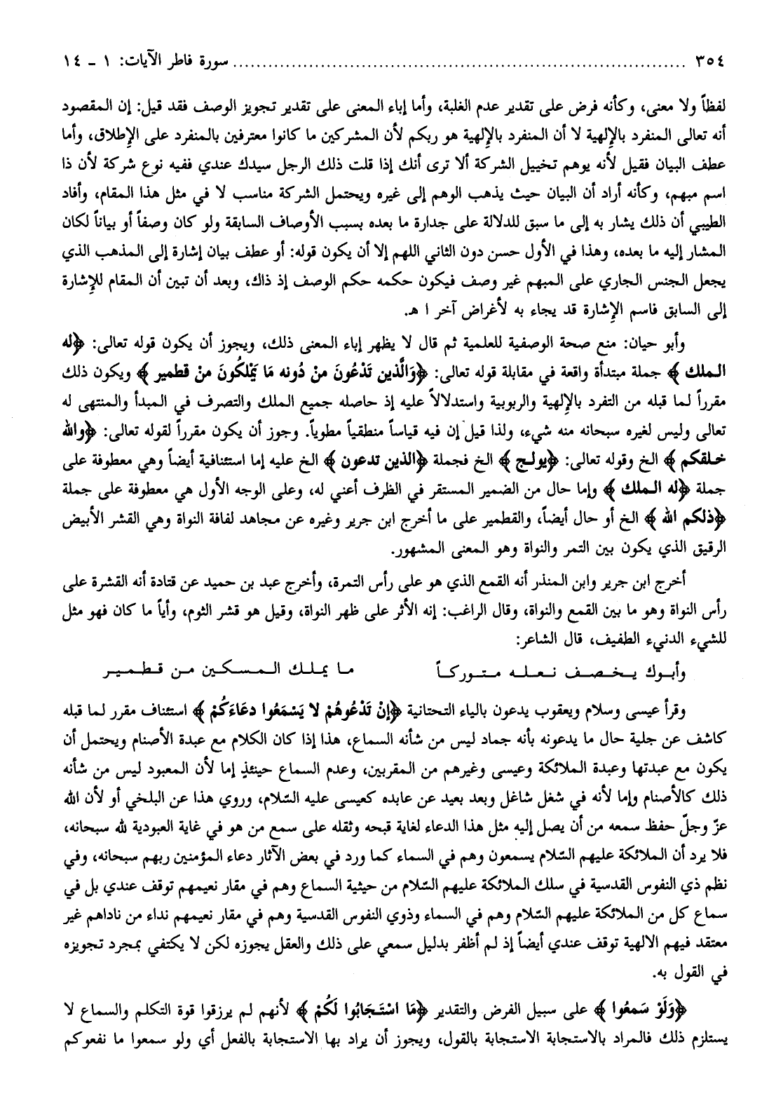 وقرأ عيسى وسلام ويعقوب يدعون بالياء التحتانية إِنْ تَدْعُوهُمْ لا يَسْمَعُوا دُعاءَكُمْ استئناف مقرر لما قبله كاشف عن جلية حال ما يدعونه بأنه جماد ليس من شأنه السماع، هذا إذا كان الكلام مع عبدة الأصنام ويحتمل أن يكون مع عبدتها وعبدة الملائكة وعيسى وغيرهم من المقربين، وعدم السماع حينئذ إما لأن المعبود ليس من شأنه ذلك كالأصنام وإما لأنه في شغل شاغل وبعد بعيد عن عابده كعيسى عليه السّلام، وروي هذا عن البلخي أو لأن الله عزّ وجلّ حفظ سمعه من أن يصل إليه مثل هذا الدعاء لغاية قبحه وثقله على سمع من هو في غاية العبودية لله سبحانه، فلا يرد أن الملائكة عليهم السّلام يسمعون وهم في السماء كما ورد في بعض الآثار دعاء المؤمنين ربهم سبحانه، وفي نظم ذي النفوس القدسية في سلك الملائكة عليهم السّلام من حيثية السماع وهم في مقار نعيمهم توقف عندي بل في سماع كل من الملائكة عليهم السّلام وهم في السماء وذوي النفوس القدسية وهم في مقار نعيمهم نداء من ناداهم غير معتقد فيهم الالهية توقف عندي أيضا إذ لم أظفر بدليل سمعي على ذلك والعقل يجوزه لكن لا يكتفي بمجرد تجويزه في القول به.