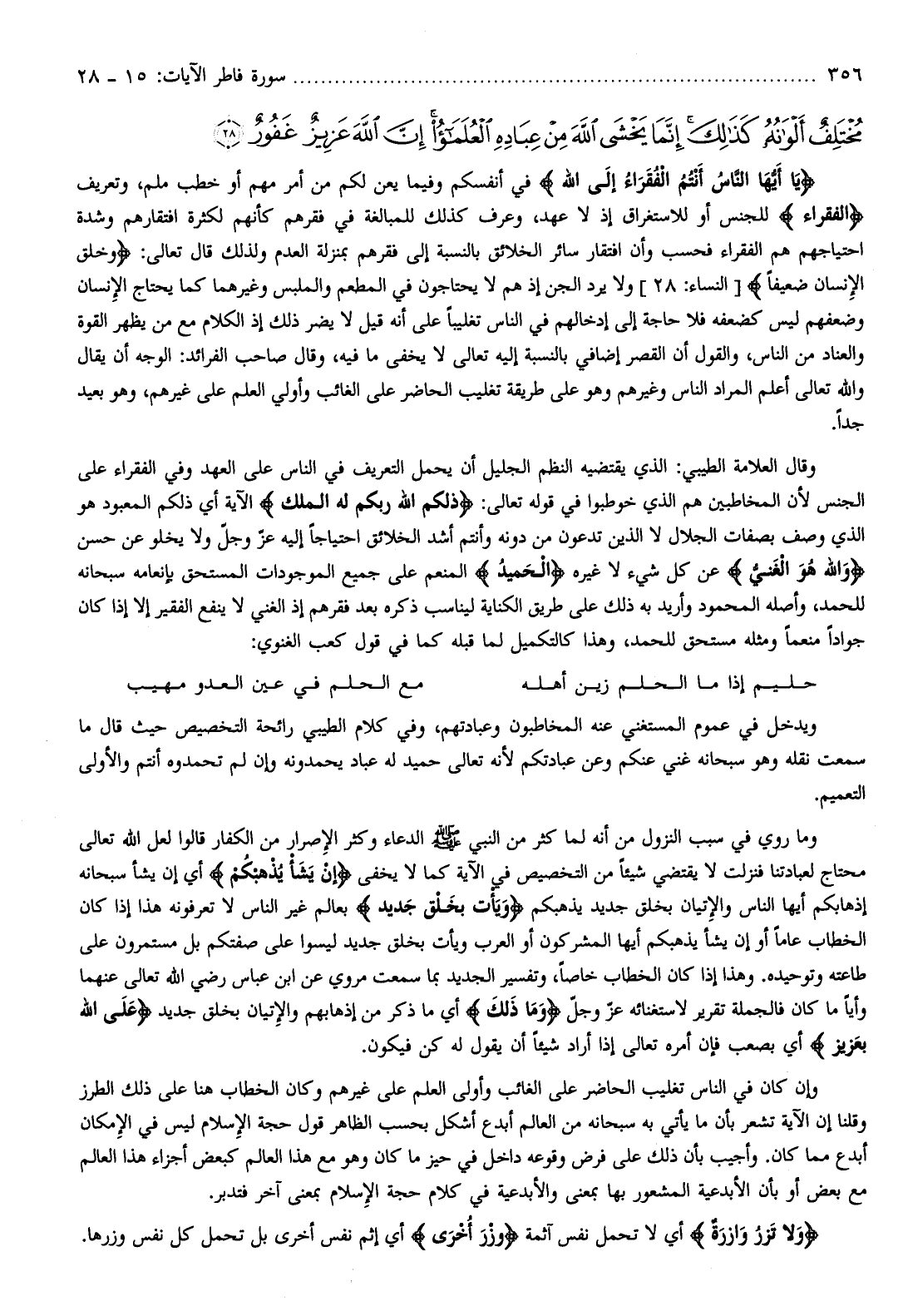 يا أَيُّهَا النَّاسُ أَنْتُمُ الْفُقَراءُ إِلَى اللَّهِ في أنفسكم وفيما يعن لكم من أمر مهم أو خطب ملم، وتعريف الْفُقَراءُ للجنس أو للاستغراق إذ لا عهد، وعرف كذلك للمبالغة في فقرهم كأنهم لكثرة افتقارهم وشدة احتياجهم هم الفقراء فحسب وأن افتقار سائر الخلائق بالنسبة إلى فقرهم بمنزلة العدم ولذلك قال تعالى: وَخُلِقَ الْإِنْسانُ ضَعِيفاً [النساء: 28] ولا يرد الجن إذ هم لا يحتاجون في المطعم والملبس وغيرهما كما يحتاج الإنسان وضعفهم ليس كضعفه فلا حاجة إلى إدخالهم في الناس تغليبا على أنه قيل لا يضر ذلك إذ الكلام مع من يظهر القوة والعناد من الناس، والقول أن القصر إضافي بالنسبة إليه تعالى لا يخفى ما فيه، وقال صاحب الفرائد: الوجه أن يقال والله تعالى أعلم المراد الناس وغيرهم وهو على طريقة تغليب الحاضر على الغائب وأولي العلم على غيرهم، وهو بعيد جدا.