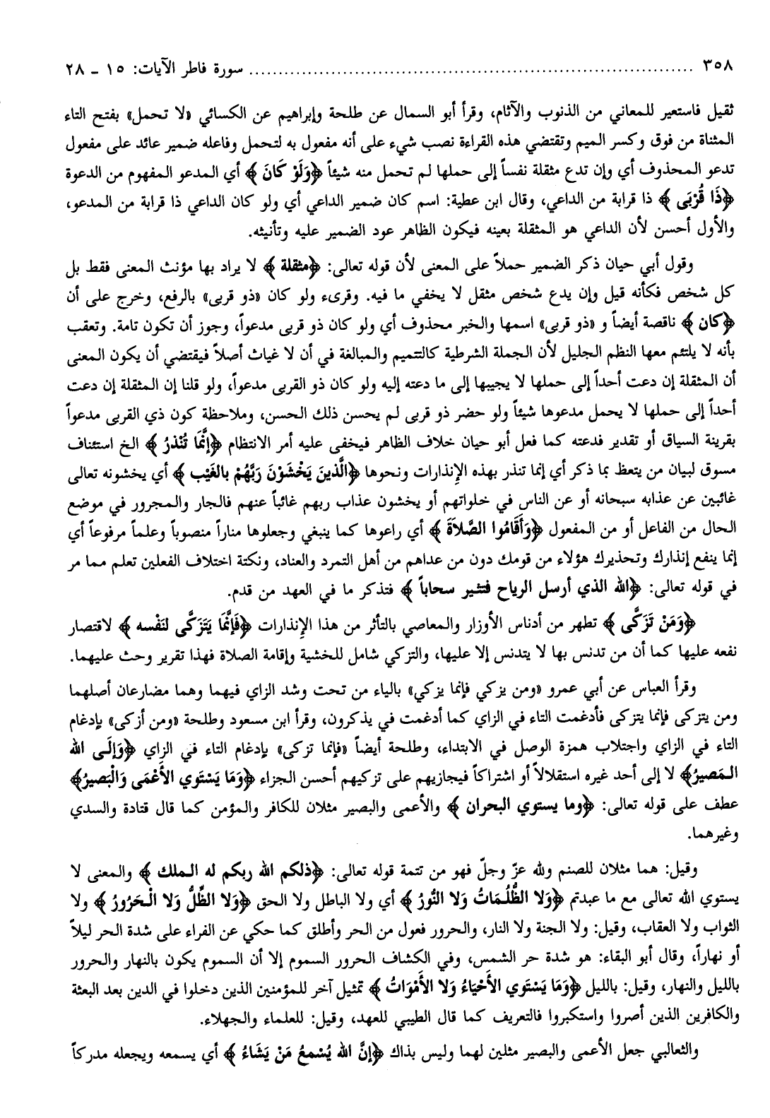 وقول أبي حيان ذكر الضمير حملا على المعنى لأن قوله تعالى: مُثْقَلَةٌ لا يراد بها مؤنث المعنى فقط بل كل شخص فكأنه قيل وإن يدع شخص مثقل لا يخفي ما فيه. وقرىء ولو كان «ذو قربى» بالرفع، وخرج على أن كانَ ناقصة أيضا و «ذو قربى» اسمها والخبر محذوف أي ولو كان ذو قربى مدعوا، وجوز أن تكون تامة. وتعقب بأنه لا يلتئم معها النظم الجليل لأن الجملة الشرطية كالتتميم والمبالغة في أن لا غياث أصلا فيقتضي أن يكون المعنى أن المثقلة إن دعت أحدا إلى حملها لا يجيبها إلى ما دعته إليه ولو كان ذو القربى مدعوا، ولو قلنا إن المثقلة إن دعت أحدا إلى حملها لا يحمل مدعوها شيئا ولو حضر ذو قربى لم يحسن ذلك الحسن، وملاحظة كون ذي القربى مدعوا بقرينة السياق أو تقدير فدعته كما فعل أبو حيان خلاف الظاهر فيخفى عليه أمر الانتظام إِنَّما تُنْذِرُ إلخ استئناف مسوق لبيان من يتعظ بما ذكر أي إنما تنذر بهذه الإنذارات ونحوها الَّذِينَ يَخْشَوْنَ رَبَّهُمْ بِالْغَيْبِ أي يخشونه تعالى غائبين عن عذابه سبحانه أو عن الناس في خلواتهم أو يخشون عذاب ربهم غائبا عنهم فالجار والمجرور في موضع الحال من الفاعل أو من المفعول وَأَقامُوا الصَّلاةَ أي راعوها كما ينبغي وجعلوها منارا منصوبا وعلما مرفوعا أي إنما ينفع إنذارك وتحذيرك هؤلاء من قومك دون من عداهم من أهل التمرد والعناد، ونكتة اختلاف الفعلين تعلم مما مر في قوله تعالى: اللَّهُ الَّذِي أَرْسَلَ الرِّياحَ فَتُثِيرُ سَحاباً فتذكر ما في العهد من قدم.