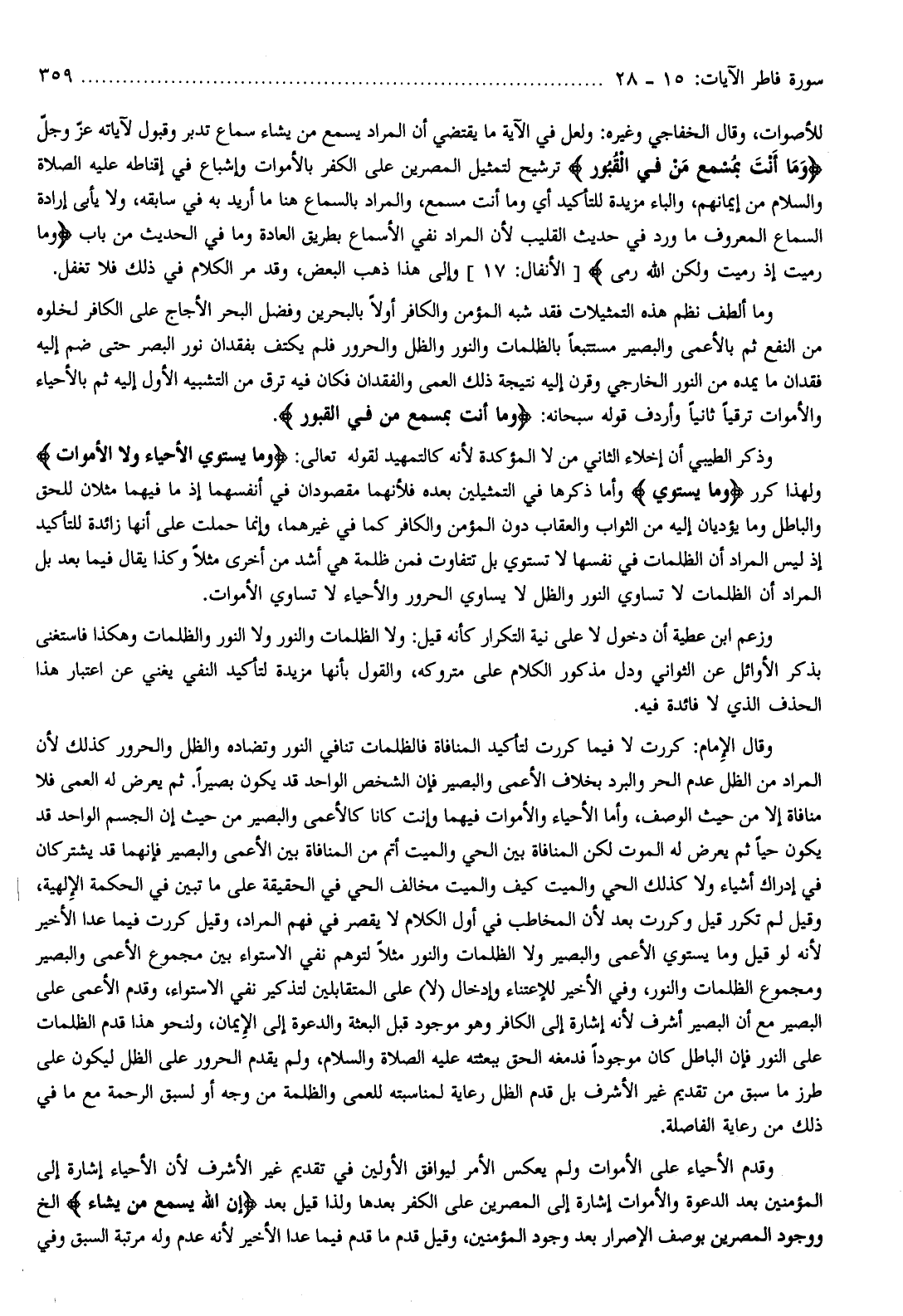وما ألطف نظم هذه التمثيلات فقد شبه المؤمن والكافر أولا بالبحرين وفضل البحر الأجاج على الكافر لخلوه من النفع ثم بالأعمى والبصير مستتبعا بالظلمات والنور والظل والحرور فلم يكتف بفقدان نور البصر حتى ضم إليه فقدان ما يمده من النور الخارجي وقرن إليه نتيجة ذلك العمى والفقدان فكان فيه ترق من التشبيه الأول إليه ثم بالأحياء والأموات ترقيا ثانيا وأردف قوله سبحانه: وَما أَنْتَ بِمُسْمِعٍ مَنْ فِي الْقُبُورِ.