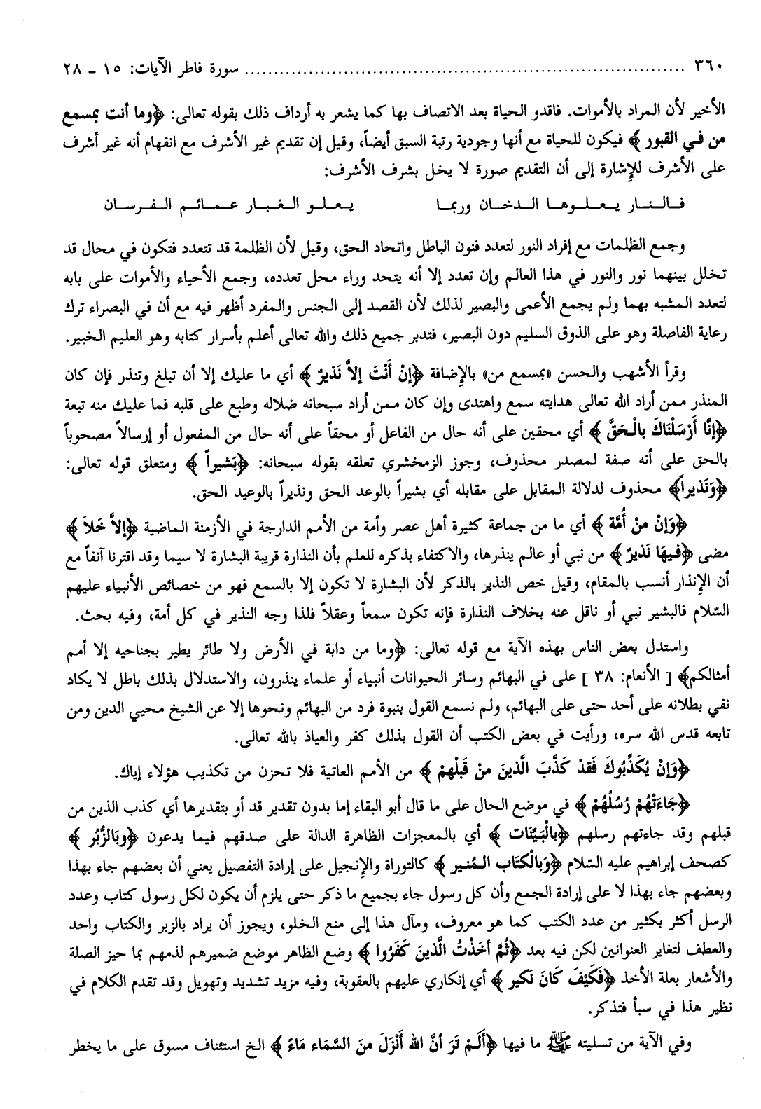 وقرأ الأشهب والحسن «بمسمع من» بالإضافة إِنْ أَنْتَ إِلَّا نَذِيرٌ أي ما عليك إلا أن تبلغ وتنذر فإن كان المنذر ممن أراد الله تعالى هدايته سمع واهتدى وإن كان ممن أراد سبحانه ضلاله وطبع على قلبه فما عليك منه تبعة إِنَّا أَرْسَلْناكَ بِالْحَقِّ أي محقين على أنه حال من الفاعل أو محقا على أنه حال من المفعول أو إرسالا مصحوبا بالحق على أنه صفة لمصدر محذوف، وجوز الزمخشري تعلقه بقوله سبحانه: بَشِيراً ومتعلق قوله تعالى: