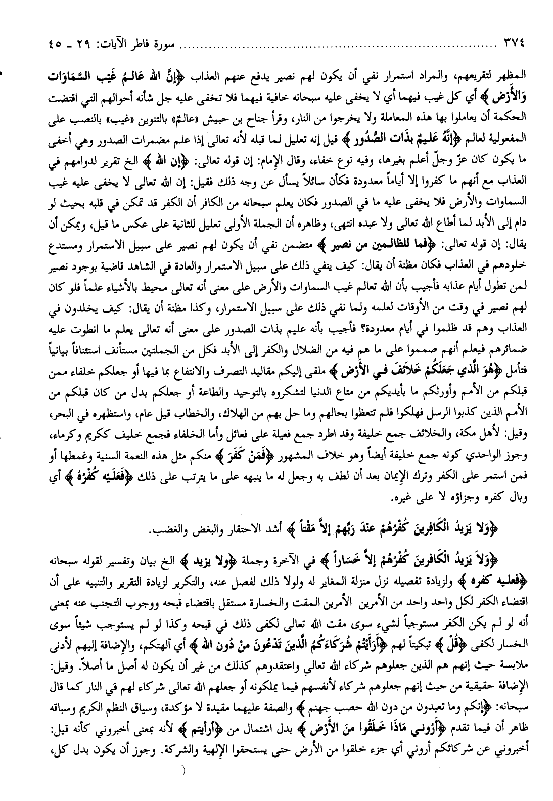 إلخ تقرير لدوامهم في العذاب مع أنهم ما كفروا إلا أياما معدودة فكأن سائلا يسأل عن وجه ذلك فقيل: إن الله تعالى لا يخفى عليه غيب السماوات والأرض فلا يخفى عليه ما في الصدور فكان يعلم سبحانه من الكافر أن الكفر قد تمكن في قلبه بحيث لو دام إلى الأبد لما أطاع الله تعالى ولا عبده انتهى، وظاهره أن الجملة الأولى تعليل للثانية على عكس ما قيل، ويمكن أن يقال: إن قوله تعالى: فَما لِلظَّالِمِينَ مِنْ نَصِيرٍ متضمن نفي أن يكون لهم نصير على سبيل الاستمرار ومستدع خلودهم في العذاب فكان مظنة أن يقال: كيف ينفي ذلك على سبيل الاستمرار والعادة في الشاهد قاضية بوجود نصير لمن تطول أيام عذابه فأجيب بأن الله عالم غيب السماوات والأرض على معنى أنه تعالى محيط بالأشياء علما فلو كان لهم نصير في وقت من الأوقات لعلمه ولما نفي ذلك على سبيل الاستمرار، وكذا مظنة أن يقال: كيف يخلدون في العذاب وهم قد ظلموا في أيام معدودة؟ فأجيب بأنه عليم بذات الصدور على معنى أنه تعالى يعلم ما انطوت عليه ضمائرهم فيعلم أنهم صمموا على ما هم فيه من الضلال والكفر إلى الأبد فكل من الجملتين مستأنف استئنافا بيانيا فتأمل هُوَ الَّذِي جَعَلَكُمْ خَلائِفَ فِي الْأَرْضِ ملقى إليكم مقاليد التصرف والانتفاع بما فيها أو جعلكم خلفاء ممن قبلكم من الأمم وأورثكم ما بأيديكم من متاع الدنيا لتشكروه بالتوحيد والطاعة أو جعلكم بدل من كان قبلكم من الأمم الذين كذبوا الرسل فهلكوا فلم تتعظوا بحالهم وما حل بهم من الهلاك، والخطاب قيل عام، واستظهره في البحر، وقيل: لأهل مكة، والخلائف جمع خليفة وقد اطرد جمع فعيلة على فعائل وأما الخلفاء فجمع خليف ككريم وكرماء، وجوز الواحدي كونه جمع خليفة أيضا وهو خلاف المشهور فَمَنْ كَفَرَ منكم مثل هذه النعمة السنية وغمطها أو فمن استمر على الكفر وترك الإيمان بعد أن لطف به وجعل له ما ينبهه على ما يترتب على ذلك فَعَلَيْهِ كُفْرُهُ أي وبال كفره وجزاؤه لا على غيره.