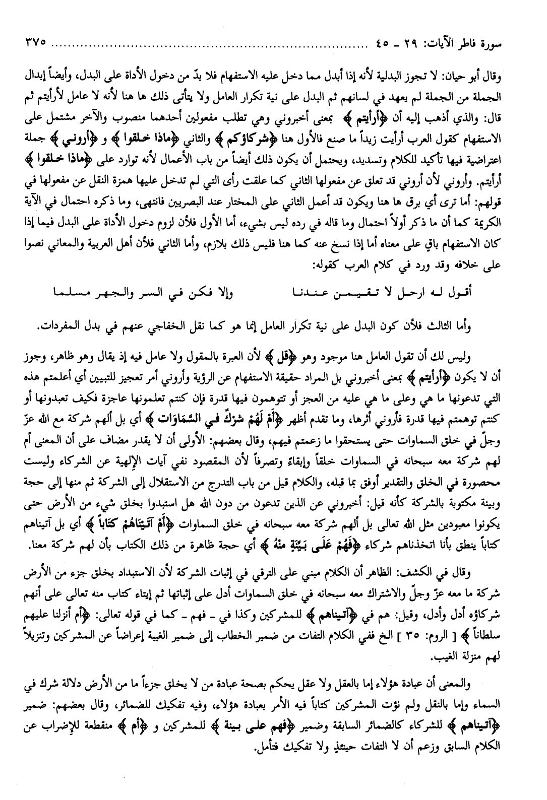 وقال أبو حيان: لا تجوز البدلية لأنه إذا أبدل مما دخل عليه الاستفهام فلا بدّ من دخول الأداة على البدل، وأيضا إبدال الجملة من الجملة لم يعهد في لسانهم ثم البدل على نية تكرار العامل ولا يتأتى ذلك هاهنا لأنه لا عامل لأرأيتم ثم قال: والذي أذهب إليه أن أَرَأَيْتُمْ بمعنى أخبروني وهي تطلب مفعولين أحدهما منصوب والآخر مشتمل على الاستفهام كقول العرب أرأيت زيدا ما صنع فالأول هنا شُرَكاءَكُمُ والثاني ماذا خَلَقُوا وأَرُونِي جملة اعتراضية فيها تأكيد للكلام وتسديد، ويحتمل أن يكون ذلك أيضا من باب الأعمال لأنه توارد على ماذا خَلَقُوا أرأيتم. وأروني لأن أروني قد تعلق عن مفعولها الثاني كما علقت رأى التي لم تدخل عليها همزة النقل عن مفعولها في قولهم: أما ترى أي برق هاهنا ويكون قد أعمل الثاني على المختار عند البصريين فانتهى، وما ذكره احتمال في الآية الكريمة كما أن ما ذكر أولا احتمال وما قاله في رده ليس بشيء، أما الأول فلأن لزوم دخول الأداة على البدل فيما إذا كان الاستفهام باق على معناه أما إذا نسخ عنه كما هنا فليس ذلك بلازم، وأما الثاني فلأن أهل العربية والمعاني نصوا على خلافه وقد ورد في كلام العرب كقوله: