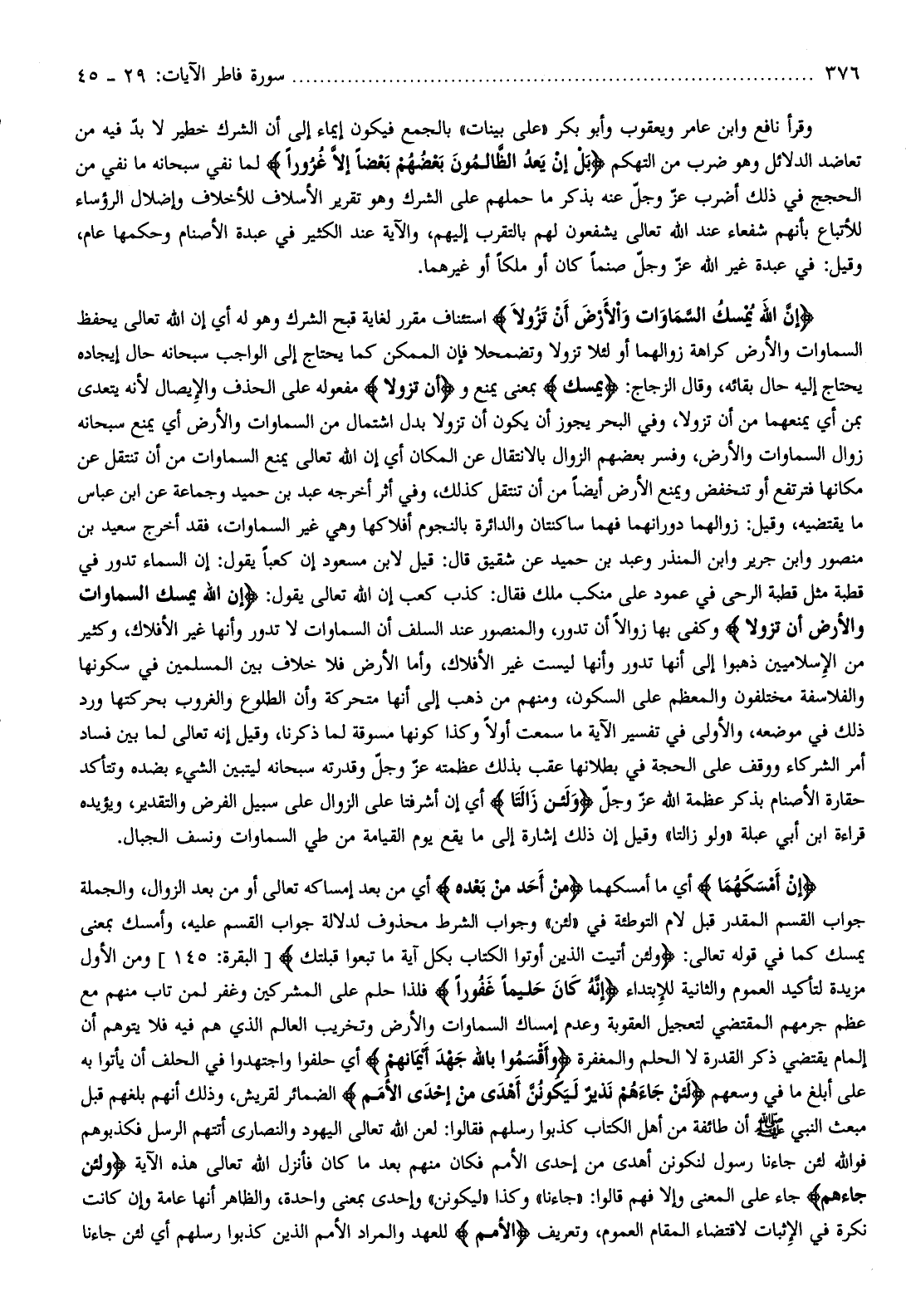 إِنَّ اللَّهَ يُمْسِكُ السَّماواتِ وَالْأَرْضَ أَنْ تَزُولا استئناف مقرر لغاية قبح الشرك وهو له أي إن الله تعالى يحفظ السماوات والأرض كراهة زوالهما أو لئلا تزولا وتضمحلا فإن الممكن كما يحتاج إلى الواجب سبحانه حال إيجاده يحتاج إليه حال بقائه، وقال الزجاج: يُمْسِكُ بمعنى يمنع وأَنْ تَزُولا مفعوله على الحذف والإيصال لأنه يتعدى بمن أي يمنعهما من أن تزولا، وفي البحر يجوز أن يكون أن تزولا بدل اشتمال من السماوات والأرض أي يمنع سبحانه زوال السماوات والأرض، وفسر بعضهم الزوال بالانتقال عن المكان أي إن الله تعالى يمنع السماوات من أن تنتقل عن مكانها فترتفع أو تنخفض ويمنع الأرض أيضا من أن تنتقل كذلك، وفي أثر أخرجه عبد بن حميد وجماعة عن ابن عباس ما يقتضيه، وقيل: زوالهما دورانهما فهما ساكنتان والدائرة بالنجوم أفلاكها وهي غير السماوات، فقد أخرج سعيد بن منصور وابن جرير وابن المنذر وعبد بن حميد عن شقيق قال: قيل لابن مسعود إن كعبا يقول: إن السماء تدور في قطبة مثل قطبة الرحى في عمود على منكب ملك فقال: كذب كعب إن الله تعالى يقول: إِنَّ اللَّهَ يُمْسِكُ السَّماواتِ وَالْأَرْضَ أَنْ تَزُولا وكفى بها زوالا أن تدور، والمنصور عند السلف أن السماوات لا تدور وأنها غير الأفلاك، وكثير من الإسلاميين ذهبوا إلى أنها تدور وأنها ليست غير الأفلاك، وأما الأرض فلا خلاف بين المسلمين في سكونها والفلاسفة مختلفون والمعظم على السكون، ومنهم من ذهب إلى أنها متحركة وأن الطلوع والغروب بحركتها ورد ذلك في موضعه، والأولى في تفسير الآية ما سمعت أولا وكذا كونها مسوقة لما ذكرنا، وقيل إنه تعالى لما بين فساد أمر الشركاء ووقف على الحجة في بطلانها عقب بذلك عظمته عزّ وجلّ وقدرته سبحانه ليتبين الشيء بضده وتتأكد حقارة الأصنام بذكر عظمة الله عزّ وجلّ وَلَئِنْ زالَتا أي إن أشرفتا على الزوال على سبيل الفرض والتقدير، ويؤيده قراءة ابن أبي عبلة «ولو زالتا» وقيل إن ذلك إشارة إلى ما يقع يوم القيامة من طي السماوات ونسف الجبال.