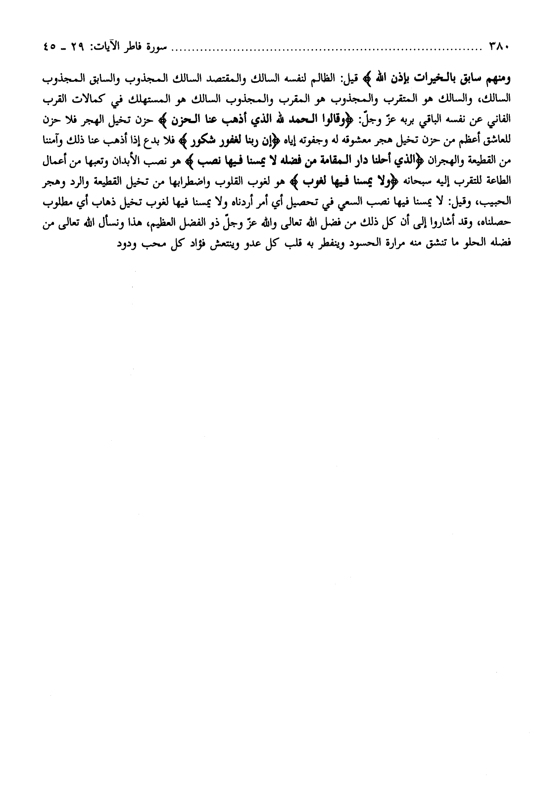 قيل: الظالم لنفسه السالك والمقتصد السالك المجذوب والسابق المجذوب السالك، والسالك هو المتقرب والمجذوب هو المقرب والمجذوب السالك هو المستهلك في كمالات القرب الفاني عن نفسه الباقي بربه عزّ وجلّ: وَقالُوا الْحَمْدُ لِلَّهِ الَّذِي أَذْهَبَ عَنَّا الْحَزَنَ حزن تخيل الهجر فلا حزن للعاشق أعظم من حزن تخيل هجر معشوقه له وجفوته إياه إِنَّ رَبَّنا لَغَفُورٌ شَكُورٌ فلا بدع إذا أذهب عنا ذلك وآمننا من القطيعة والهجران الَّذِي أَحَلَّنا دارَ الْمُقامَةِ مِنْ فَضْلِهِ لا يَمَسُّنا فِيها نَصَبٌ هو نصب الأبدان وتعبها من أعمال الطاعة للتقرب إليه سبحانه وَلا يَمَسُّنا فِيها لُغُوبٌ هو لغوب القلوب واضطرابها من تخيل القطيعة والرد وهجر الحبيب، وقيل: لا يمسنا فيها نصب السعي في تحصيل أي أمر أردناه ولا يمسنا فيها لغوب تخيل ذهاب أي مطلوب حصلناه، وقد أشاروا إلى أن كل ذلك من فضل الله تعالى والله عزّ وجلّ ذو الفضل العظيم، هذا ونسأل الله تعالى من فضله الحلو ما تنشق منه مرارة الحسود وينفطر به قلب كل عدو وينتعش فؤاد كل محب ودود