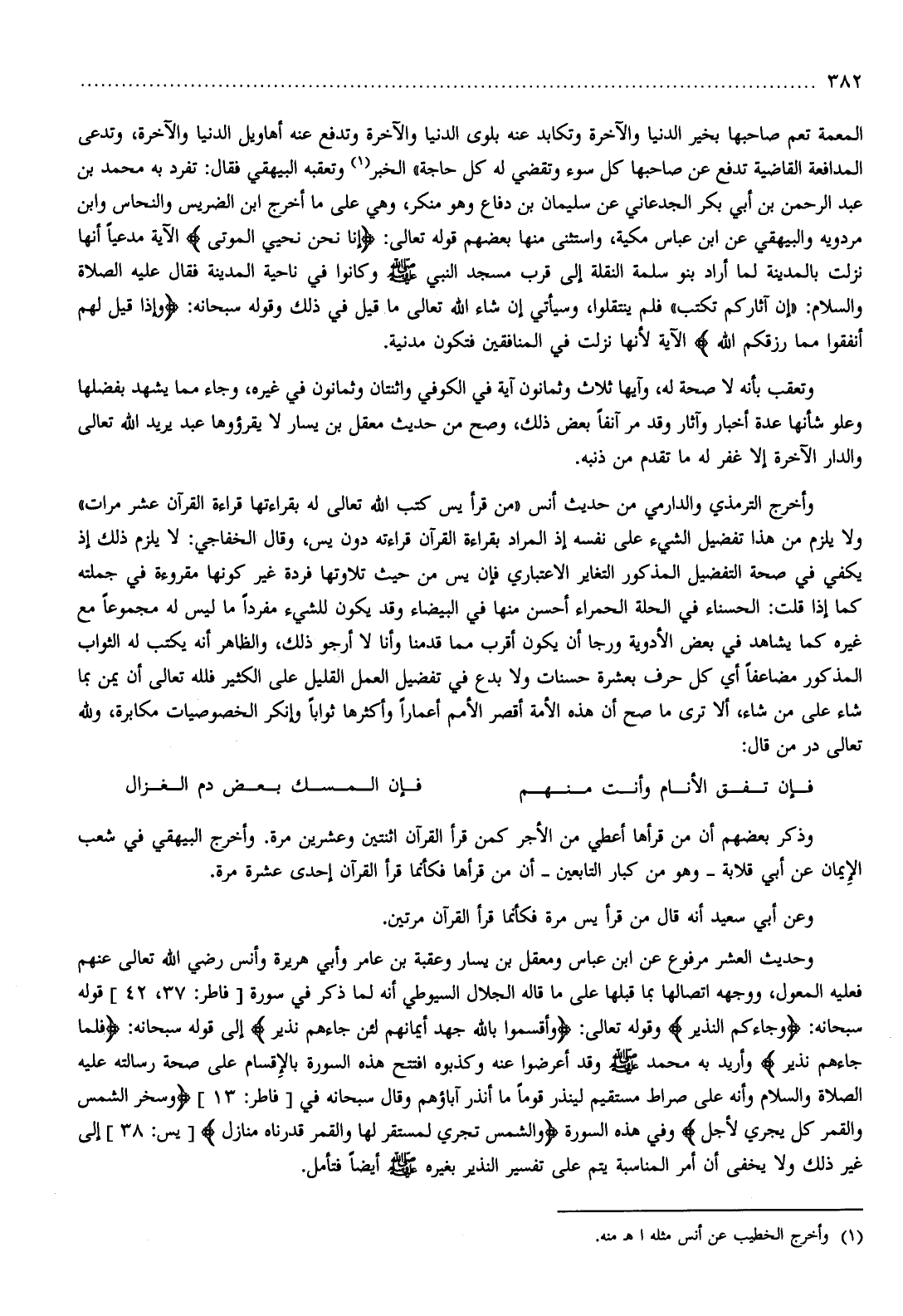 ولا يلزم من هذا تفضيل الشيء على نفسه إذ المراد بقراءة القرآن قراءته دون يس، وقال الخفاجي: لا يلزم ذلك إذ يكفي في صحة التفضيل المذكور التغاير الاعتباري فإن يس من حيث تلاوتها فردة غير كونها مقروءة في جملته كما إذا قلت: الحسناء في الحلة الحمراء أحسن منها في البيضاء وقد يكون للشيء مفردا ما ليس له مجموعا مع غيره كما يشاهد في بعض الأدوية ورجا أن يكون أقرب مما قدمنا وأنا لا أرجو ذلك، والظاهر أنه يكتب له الثواب المذكور مضاعفا أي كل حرف بعشرة حسنات ولا بدع في تفضيل العمل القليل على الكثير فلله تعالى أن يمن بما شاء على من شاء، ألا ترى ما صح أن هذه الأمة أقصر الأمم أعمارا وأكثرها ثوابا وأنكر الخصوصيات مكابرة، ولله تعالى در من قال: