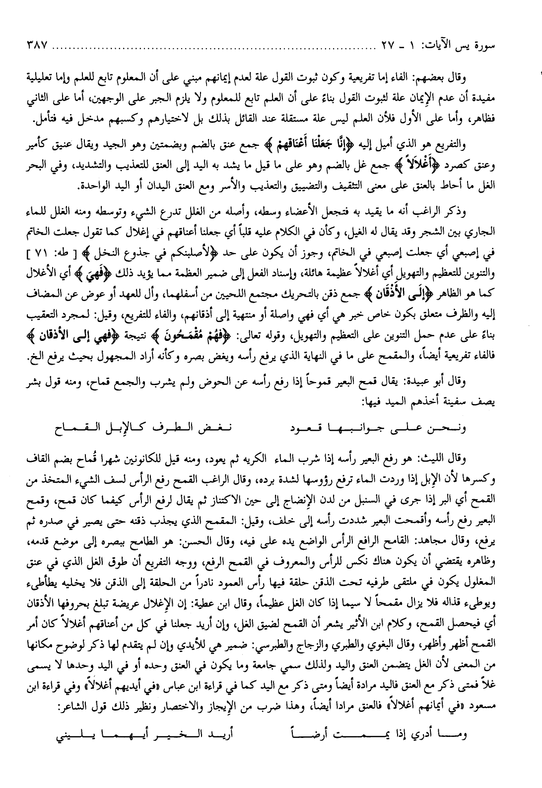والتفريع هو الذي أميل إليه إِنَّا جَعَلْنا فِي أَعْناقِهِمْ جمع عنق بالضم وبضمتين وهو الجيد ويقال عنيق كأمير وعنق كصرد أَغْلالًا جمع غل بالضم وهو على ما قيل ما يشد به اليد إلى العنق للتعذيب والتشديد، وفي البحر الغل ما أحاط بالعنق على معنى التثقيف والتضييق والتعذيب والأسر ومع العنق اليدان أو اليد الواحدة.