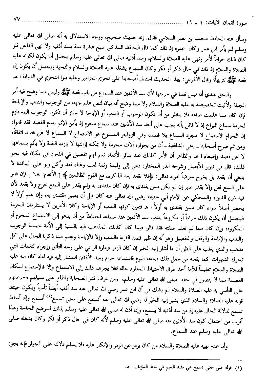 وسأل عنه الحافظ محمد بن نصر السلامي فقال: إنه حديث صحيح، ووجه الاستدلال به أنه صلى الله تعالى عليه وسلم لم يأمر ابن عمر وكان عمره إذ ذاك كما قال الحافظ المذكور سبع عشرة سنة بسد أذنيه ولا نهى الفاعل فلو كان ذلك حراما لأمر ونهى عليه الصلاة والسلام، وسد أذنيه صلى الله تعالى عليه وسلم يحتمل أن يكون لكونه عليه الصلاة والسلام إذ ذاك في حال ذكر أو فكر وكان السماع يشغله عليه الصلاة والسلام والتحية ويحتمل أن يكون إنما فعله صلّى الله عليه وسلم تنزيها وقال الأذرعي: بهذا الحديث استدل أصحابنا على تحريم المزامير وعليه بنوا التحريم في الشبابة اهـ.