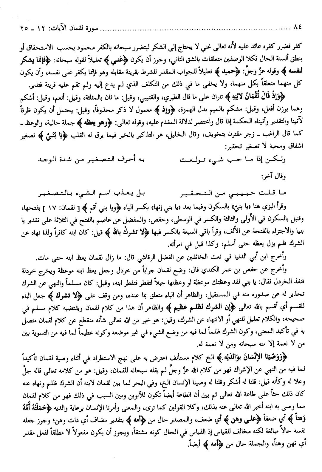 وَإِذْ قالَ لُقْمانُ لِابْنِهِ تاران على ما قال الطبري، والقتيبي، وقيل: ما ثان بالمثلثة، وقيل: أنعم، وقيل: أشكم وهما بوزن أفعل، وقيل: مشكم بالميم بدل الهمزة، وَإِذْ معمول لا ذكر محذوفا، وقيل: يحتمل أن يكون ظرفا لآتينا والتقدير وآتيناه الحكمة إذا قال واختصر لدلالة المقدم عليه، وقوله تعالى: وَهُوَ يَعِظُهُ جملة حالية، والوعظ- كما قال الراغب- زجر مقترن بتخويف، وقال الخليل، هو التذكير بالخير فيما يرق له القلب يا بُنَيَّ تصغير اشفاق ومحبة لا تصغير تحقير: