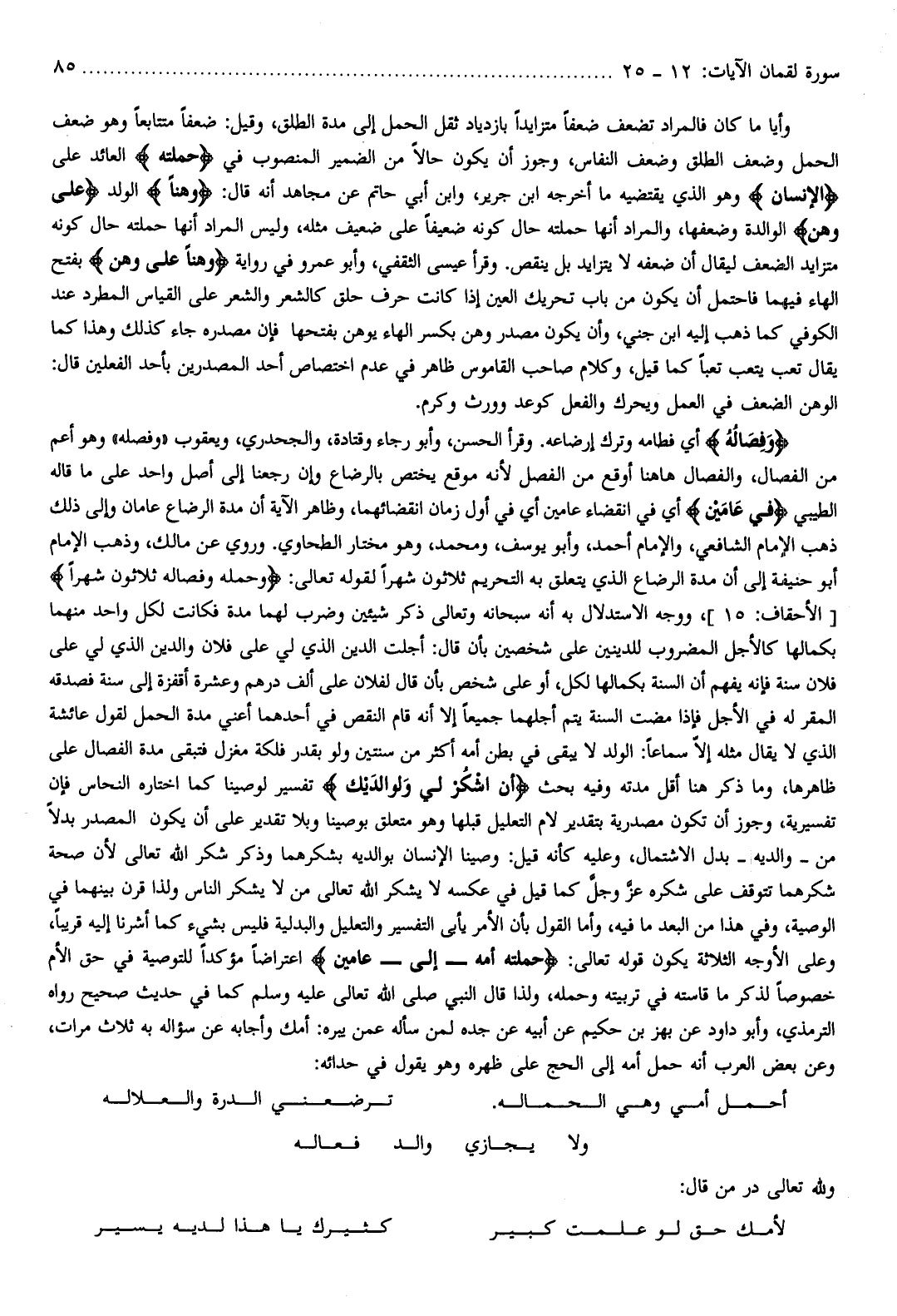 وَفِصالُهُ أي فطامه وترك إرضاعه. وقرأ الحسن، وأبو رجاء وقتادة، والجحدري، ويعقوب «وفصله» وهو أعم من الفصال، والفصال هاهنا أوقع من الفصل لأنه موقع يختص بالرضاع وإن رجعنا إلى أصل واحد على ما قاله الطيبي فِي عامَيْنِ أي في انقضاء عامين أي في أول زمان انقضائهما، وظاهر الآية أن مدة الرضاع عامان وإلى ذلك ذهب الإمام الشافعي، والإمام أحمد، وأبو يوسف، ومحمد، وهو مختار الطحاوي. وروي عن مالك، وذهب الإمام أبو حنيفة إلى أن مدة الرضاع الذي يتعلق به التحريم ثلاثون شهرا لقوله تعالى: وَحَمْلُهُ وَفِصالُهُ ثَلاثُونَ شَهْراً [الأحقاف: 15] ، ووجه الاستدلال به أنه سبحانه وتعالى ذكر شيئين وضرب لهما مدة فكانت لكل واحد منهما بكمالها كالأجل المضروب للدينين على شخصين بأن قال: أجلت الدين الذي لي على فلان والدين الذي لي على فلان سنة فإنه يفهم أن السنة بكمالها لكل، أو على شخص بأن قال لفلان على ألف درهم وعشرة أقفزة إلى سنة فصدقه المقر له في الأجل فإذا مضت السنة يتم أجلهما جميعا إلا أنه قام النقص في أحدهما أعني مدة الحمل لقول عائشة الذي لا يقال مثله إلّا سماعا: الولد لا يبقى في بطن أمه أكثر من سنتين ولو بقدر فلكة مغزل فتبقى مدة الفصال على ظاهرها، وما ذكر هنا أقل مدته وفيه بحث أَنِ اشْكُرْ لِي وَلِوالِدَيْكَ تفسير لوصينا كما اختاره النحاس فإن تفسيرية، وجوز أن تكون مصدرية بتقدير لام التعليل قبلها وهو متعلق بوصينا وبلا تقدير على أن يكون المصدر بدلا من- والديه- بدل الاشتمال، وعليه كأنه قيل: وصينا الإنسان بوالديه بشكرهما وذكر شكر الله تعالى لأن صحة شكرهما تتوقف على شكره عزّ وجلّ كما قيل في عكسه لا يشكر الله تعالى من لا يشكر الناس ولذا قرن بينهما في الوصية، وفي هذا من البعد ما فيه، وأما القول بأن الأمر يأبى التفسير والتعليل والبدلية فليس بشيء كما أشرنا إليه قريبا، وعلى الأوجه الثلاثة يكون قوله تعالى: حَمَلَتْهُ أُمُّهُ- إلى- عامَيْنِ اعتراضا مؤكدا للتوصية في حق الأم خصوصا لذكر ما قاسته في تربيته وحمله، ولذا