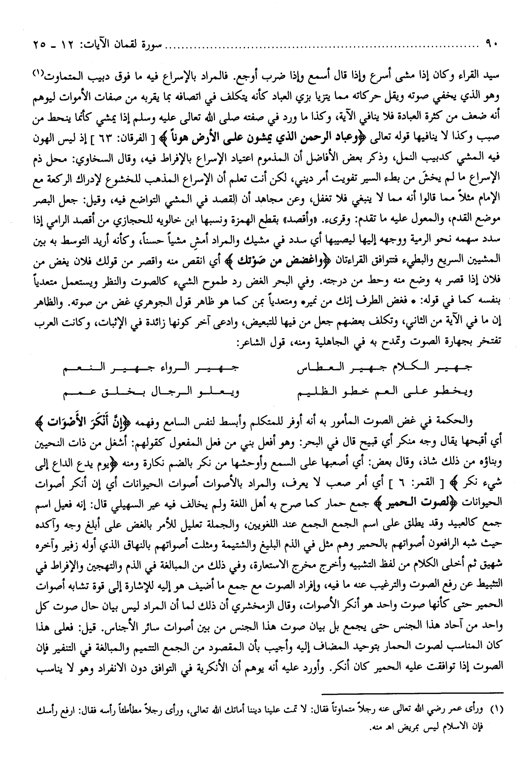 سيد القراء وكان إذا مشى أسرع وإذا قال أسمع وإذا ضرب أوجع. فالمراد بالإسراع فيه ما فوق دبيب المتماوت (¬1) وهو الذي يخفي صوته ويقل حركاته مما يتزيا بزي العباد كأنه يتكلف في اتصافه بما يقربه من صفات الأموات ليوهم أنه ضعف من كثرة العبادة فلا ينافي الآية، وكذا ما ورد في صفته صلى الله تعالى عليه وسلم إذا يمشي كأنما ينحط من صبب وكذا لا ينافيها قوله تعالى وَعِبادُ الرَّحْمنِ الَّذِينَ يَمْشُونَ عَلَى الْأَرْضِ هَوْناً [الفرقان: 63] إذ ليس الهون فيه المشي كدبيب النمل، وذكر بعض الأفاضل أن المذموم اعتياد الإسراع بالإفراط فيه، وقال السخاوي: محل ذم الإسراع ما لم يخش من بطء السير تفويت أمر ديني، لكن أنت تعلم أن الإسراع المذهب للخشوع لإدراك الركعة مع الإمام مثلا مما قالوا أنه مما لا ينبغي فلا تغفل، وعن مجاهد أن القصد في المشي التواضع فيه، وقيل: جعل البصر موضع القدم، والمعول عليه ما تقدم: وقرىء. «وأقصد» بقطع الهمزة ونسبها ابن خالويه للحجازي من أقصد الرامي إذا سدد سهمه نحو الرمية ووجهه إليها ليصيبها أي سدد في مشيك والمراد أمش مشيا حسنا، وكأنه أريد التوسط به بين المشيين السريع والبطيء فتتوافق القراءتان وَاغْضُضْ مِنْ صَوْتِكَ أي انقص منه واقصر من قولك فلان يغض من فلان إذا قصر به وضع منه وحط من درجته. وفي البحر الغض رد طموح الشيء كالصوت والنظر ويستعمل متعديا بنفسه كما في قوله: فغض الطرف إنك من نمير ومتعديا بمن كما هو ظاهر قول الجوهري غض من صوته. والظاهر إن ما في الآية من الثاني، وتكلف بعضهم جعل من فيها للتبعيض، وادعى آخر كونها زائدة في الإثبات، وكانت العرب تفتخر بجهارة الصوت وتمدح به في الجاهلية ومنه، قول الشاعر: