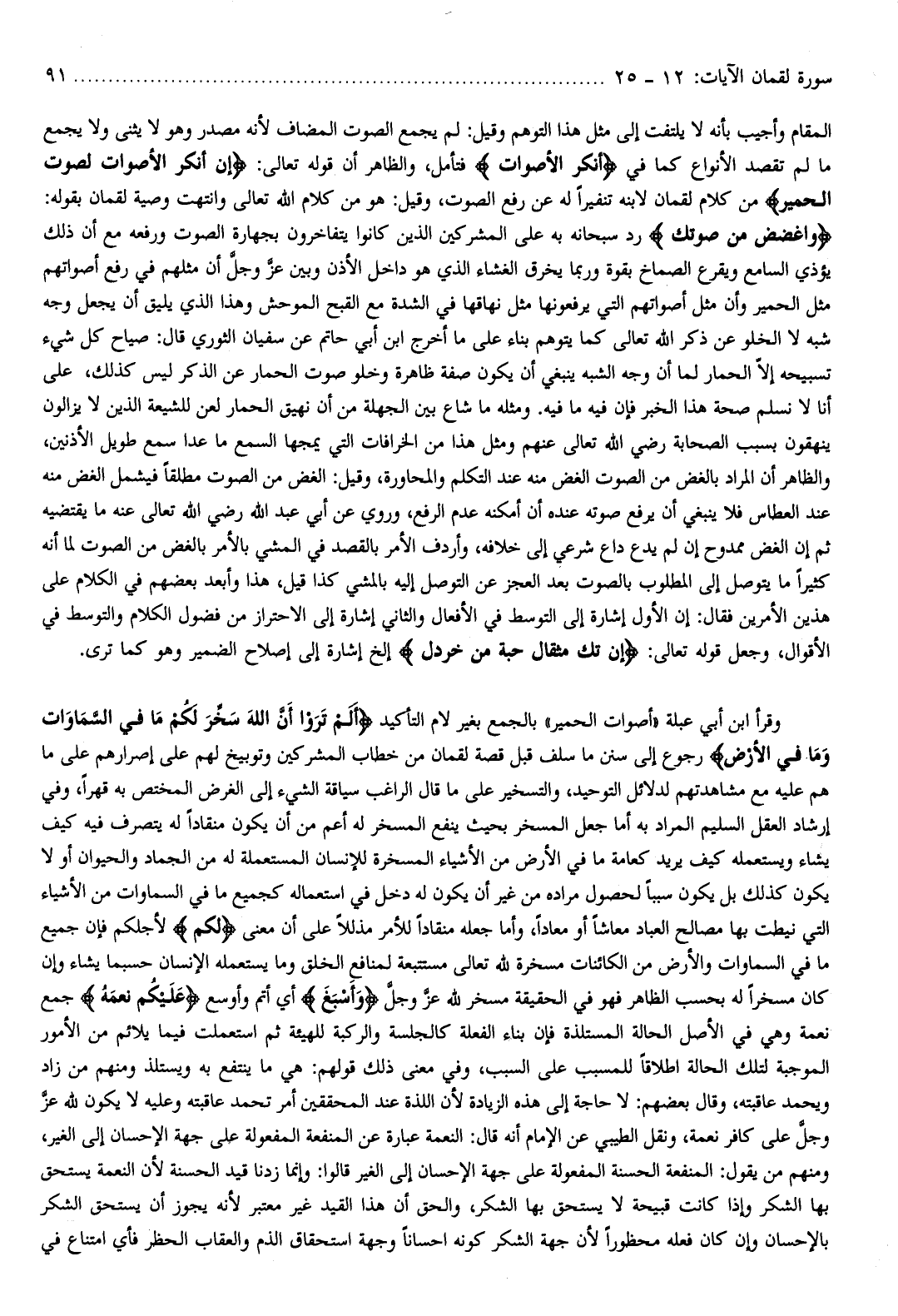 وقرأ ابن أبي عبلة «أصوات الحمير» بالجمع بغير لام التأكيد أَلَمْ تَرَوْا أَنَّ اللَّهَ سَخَّرَ لَكُمْ ما فِي السَّماواتِ وَما فِي الْأَرْضِ رجوع إلى سنن ما سلف قبل قصة لقمان من خطاب المشركين وتوبيخ لهم على إصرارهم على ما هم عليه مع مشاهدتهم لدلائل التوحيد، والتسخير على ما قال الراغب سياقة الشيء إلى الغرض المختص به قهرا، وفي إرشاد العقل السليم المراد به أما جعل المسخر بحيث ينفع المسخر له أعم من أن يكون منقادا له يتصرف فيه كيف يشاء ويستعمله كيف يريد كعامة ما في الأرض من الأشياء المسخرة للإنسان المستعملة له من الجماد والحيوان أو لا يكون كذلك بل يكون سببا لحصول مراده من غير أن يكون له دخل في استعماله كجميع ما في السماوات من الأشياء التي نيطت بها مصالح العباد معاشا أو معادا، وأما جعله منقادا للأمر مذللا على أن معنى لَكُمْ لأجلكم فإن جميع ما في السماوات والأرض من الكائنات مسخرة لله تعالى مستتبعة لمنافع الخلق وما يستعمله الإنسان حسبما يشاء وإن كان مسخرا له بحسب الظاهر فهو في الحقيقة مسخر لله عزّ وجلّ وَأَسْبَغَ أي أتم وأوسع عَلَيْكُمْ نِعَمَهُ جمع نعمة وهي في الأصل الحالة المستلذة فإن بناء الفعلة كالجلسة والركبة للهيئة ثم استعملت فيما يلائم من الأمور الموجبة لتلك الحالة إطلاقا للمسبب على السبب، وفي معنى ذلك قولهم: هي ما ينتفع به ويستلذ ومنهم من زاد ويحمد عاقبته، وقال بعضهم: لا حاجة إلى هذه الزيادة لأن اللذة عند المحققين أمر تحمد عاقبته وعليه لا يكون لله عز وجلّ على كافر نعمة، ونقل الطيبي عن الإمام أنه قال: النعمة عبارة عن المنفعة المفعولة على جهة الإحسان إلى الغير، ومنهم من يقول: المنفعة الحسنة المفعولة على جهة الإحسان إلى الغير قالوا: وإنما زدنا قيد الحسنة لأن النعمة يستحق بها الشكر وإذا كانت قبيحة لا يستحق بها الشكر، والحق أن هذا القيد غير معتبر لأنه يجوز أن يستحق الشكر بالإحسان وإن كان فعله محظورا لأن جهة الشكر كونه إحسانا وجهة استحقاق الذم والعقاب الحظر فأي امتناع في