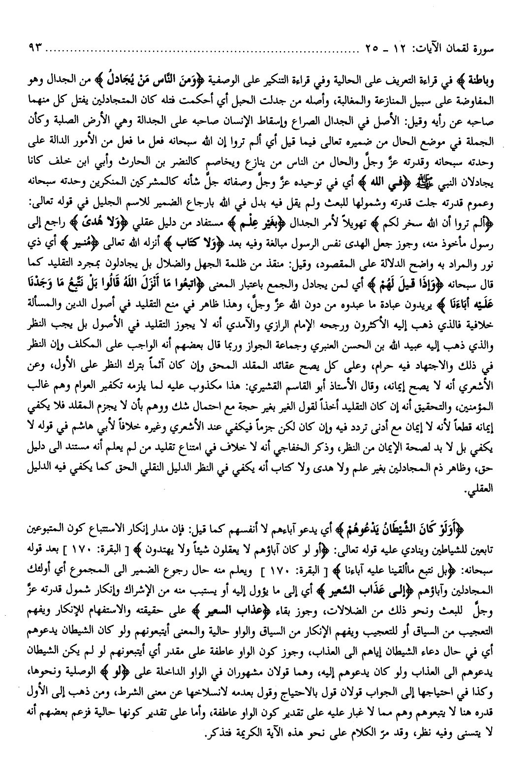 أَلَمْ تَرَوْا أَنَّ اللَّهَ سَخَّرَ لَكُمْ تهويلا لأمر الجدال بِغَيْرِ عِلْمٍ مستفاد من دليل عقلي وَلا هُدىً راجع إلى رسول مأخوذ منه، وجوز جعل الهدى نفس الرسول مبالغة وفيه بعد وَلا كِتابٍ أنزله الله تعالى مُنِيرٍ أي ذي نور والمراد به واضح الدلالة على المقصود، وقيل: منقذ من ظلمة الجهل والضلال بل يجادلون بمجرد التقليد كما قال سبحانه وَإِذا قِيلَ لَهُمُ أي لمن يجادل والجمع باعتبار المعنى اتَّبِعُوا ما أَنْزَلَ اللَّهُ قالُوا بَلْ نَتَّبِعُ ما وَجَدْنا عَلَيْهِ آباءَنا يريدون عبادة ما عبدوه من دون الله عزّ وجلّ، وهذا ظاهر في منع التقليد في أصول الدين والمسألة خلافية فالذي ذهب إليه الأكثرون ورجحه الإمام الرازي والآمدي أنه لا يجوز التقليد في الأصول بل يجب النظر والذي ذهب إليه عبيد الله بن الحسن العنبري وجماعة الجواز وربما قال بعضهم أنه الواجب على المكلف وإن النظر في ذلك والاجتهاد فيه حرام، وعلى كل يصح عقائد المقلد المحق وإن كان آثما بترك النظر على الأول، وعن الأشعري أنه لا يصح إيمانه، وقال الأستاذ أبو القاسم القشيري: هذا مكذوب عليه لما يلزمه تكفير العوام وهم غالب المؤمنين، والتحقيق أنه إن كان التقليد أخذا لقول الغير بغير حجة مع احتمال شك ووهم بأن لا يجزم المقلد فلا يكفي إيمانه قطعا لأنه لا إيمان مع أدنى تردد فيه وإن كان لكن جزما فيكفي عند الأشعري وغيره خلافا لأبي هاشم في قوله لا يكفي بل لا بد لصحة الإيمان من النظر، وذكر الخفاجي أنه لا خلاف في امتناع تقليد من لم يعلم أنه مستند الى دليل حق، وظاهر ذم المجادلين بغير علم ولا هدى ولا كتاب أنه يكفي في النظر الدليل النقلي الحق كما يكفي فيه الدليل العقلي.