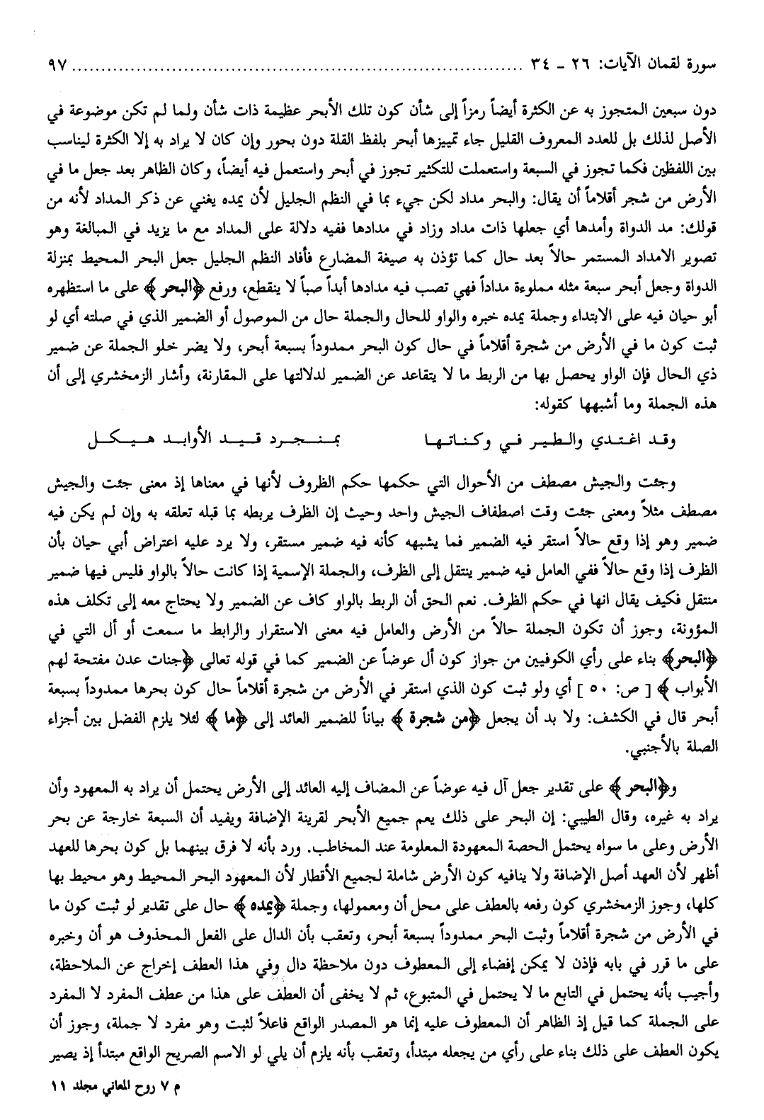 والْبَحْرُ على تقدير جعل آل فيه عوضا عن المضاف إليه العائد إلى الأرض يحتمل أن يراد به المعهود وأن يراد به غيره، وقال الطيبي: إن البحر على ذلك يعم جميع الأبحر لقرينة الإضافة ويفيد أن السبعة خارجة عن بحر الأرض وعلى ما سواه يحتمل الحصة المعهودة المعلومة عند المخاطب. ورد بأنه لا فرق بينهما بل كون بحرها للعهد أظهر لأن العهد أصل الإضافة ولا ينافيه كون الأرض شاملة لجميع الأقطار لأن المعهود البحر المحيط وهو محيط بها كلها، وجوز الزمخشري كون رفعه بالعطف على محل أن ومعمولها، وجملة يَمُدُّهُ حال على تقدير لو ثبت كون ما في الأرض من شجرة أقلاما وثبت أقلاما وثبت البحر ممدودا بسبعة أبحر، وتعقب بأن الدال على الفعل المحذوف هو أن وخبره على ما قرر في بابه فإذن لا يمكن إفضاء إلى المعطوف دون ملاحظة دال وفي هذا العطف إخراج عن الملاحظة، وأجيب بأنه يحتمل في التابع ما لا يحتمل في المتبوع، ثم لا يخفى أن العطف على هذا من عطف المفرد لا المفرد على الجملة كما قيل إذ الظاهر أن المعطوف عليه إنما هو المصدر الواقع فاعلا لثبت وهو مفرد لا جملة، وجوز أن يكون العطف على ذلك بناء على رأي من يجعله مبتدأ، وتعقب بأنه يلزم أن يلي لو الاسم الصريح الواقع مبتدأ إذ يصير