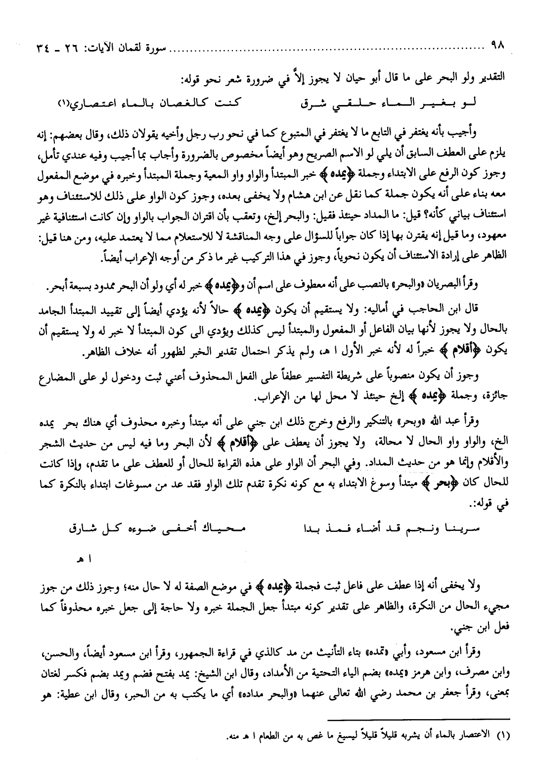 وقرأ البصريان «والبحر» بالنصب على أنه معطوف على اسم أن ويَمُدُّهُ خبر له أي ولو أن البحر ممدود بسبعة أبحر.