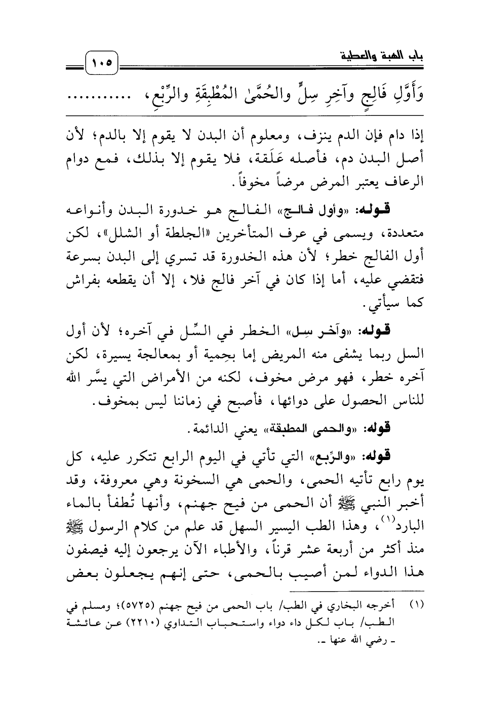 قوله: «والرِّبع» التي تأتي في اليوم الرابع تتكرر عليه، كل يوم رابع تأتيه الحمى، والحمى هي السخونة وهي معروفة، وقد أخبر النبي صلّى الله عليه وسلّم أن الحمى من فيح جهنم، وأنها تُطفأ بالماء البارد (¬1)، وهذا الطب اليسير السهل قد علم من كلام الرسول صلّى الله عليه وسلّم منذ أكثر من أربعة عشر قرناً، والأطباء الآن يرجعون إليه فيصفون هذا الدواء لمن أصيب بالحمى، حتى إنهم يجعلون بعض