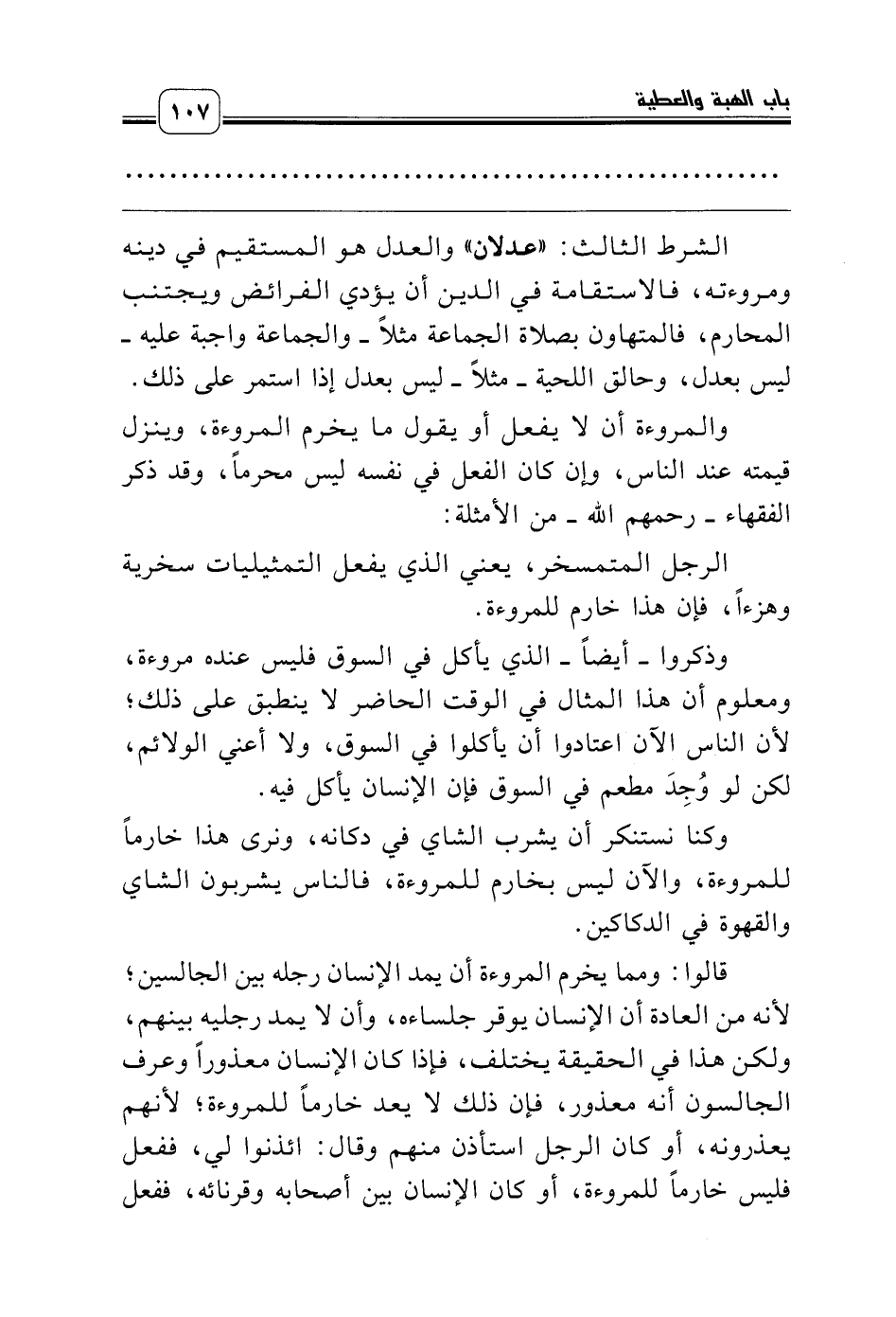 وذكروا ـ أيضاً ـ الذي يأكل في السوق فليس عنده مروءة، ومعلوم أن هذا المثال في الوقت الحاضر لا ينطبق على ذلك؛ لأن الناس الآن اعتادوا أن يأكلوا في السوق، ولا أعني الولائم، لكن لو وُجِدَ مطعم في السوق فإن الإنسان يأكل فيه.