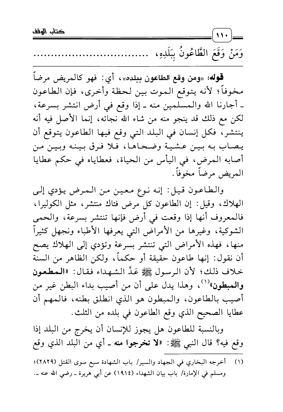 وبالنسبة للطاعون هل يجوز للإنسان أن يخرج من البلد إذا وقع فيه؟ قال النبي صلّى الله عليه وسلّم: «لا تخرجوا منه ـ أي من البلد الذي وقع