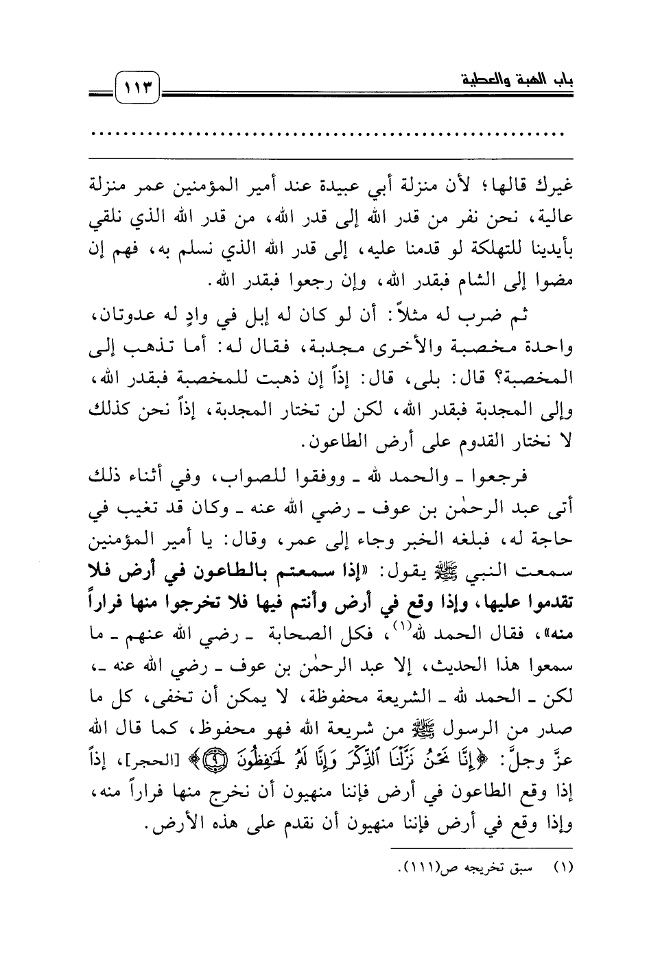 غيرك قالها؛ لأن منزلة أبي عبيدة عند أمير المؤمنين عمر منزلة عالية، نحن نفر من قدر الله إلى قدر الله، من قدر الله الذي نلقي بأيدينا للتهلكة لو قدمنا عليه، إلى قدر الله الذي نسلم به، فهم إن مضوا إلى الشام فبقدر الله، وإن رجعوا فبقدر الله.