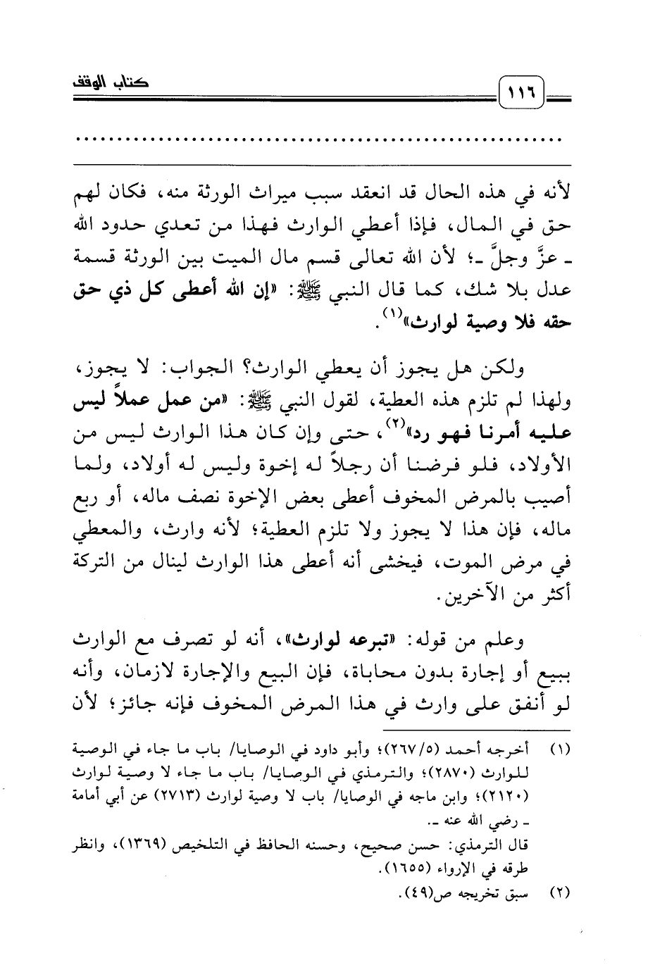 (¬1) أخرجه أحمد (5/ 267)؛ وأبو داود في الوصايا/ باب ما جاء في الوصية للوارث (2870)؛ والترمذي في الوصايا/ باب ما جاء لا وصية لوارث (2120)؛ وابن ماجه في الوصايا/ باب لا وصية لوارث (2713) عن أبي أمامة ـ رضي الله عنه ـ.