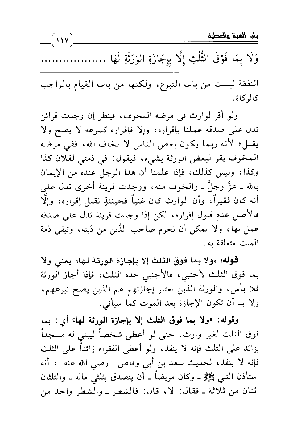 وقوله: «ولا بما فوق الثلث إلا بإجازة الورثة لها» أي: بما فوق الثلث لغير وارث، حتى لو أعطى شخصاً ليبني له مسجداً بزائد على الثلث فإنه لا ينفذ، ولو أعطى الفقراء زائداً على الثلث فإنه لا ينفذ، لحديث سعد بن أبي وقاص ـ رضي الله عنه ـ، أنه استأذن النبي صلّى الله عليه وسلّم ـ وكان مريضاً ـ أن يتصدق بثلثي ماله ـ والثلثان اثنان من ثلاثة ـ فقال: لا، قال: فالشطر ـ والشطر واحد من