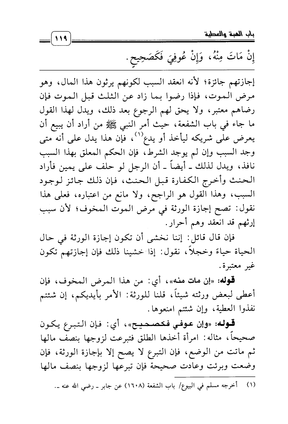 قوله: «وإن عوفي فكصحيح»، أي: فإن التبرع يكون صحيحاً، مثاله: امرأة أخذها الطلق فتبرعت لزوجها بنصف مالها ثم ماتت من الوضع، فإن التبرع لا يصح إلا بإجازة الورثة، فإن وضعت وبرئت وعادت صحيحة فإن تبرعها لزوجها بنصف مالها