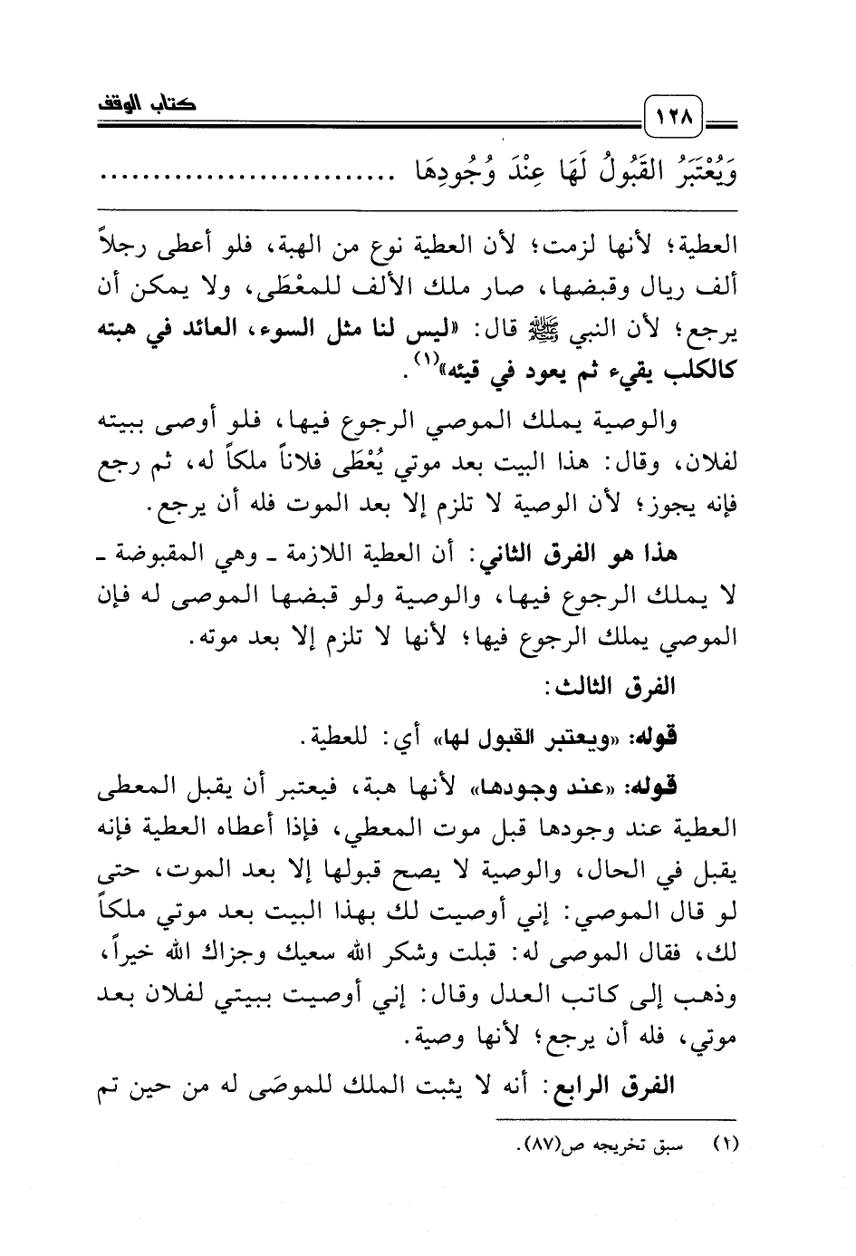 هذا هو الفرق الثاني: أن العطية اللازمة ـ وهي المقبوضة ـ لا يملك الرجوع فيها، والوصية ولو قبضها الموصى له فإن الموصي يملك الرجوع فيها؛ لأنها لا تلزم إلا بعد موته.