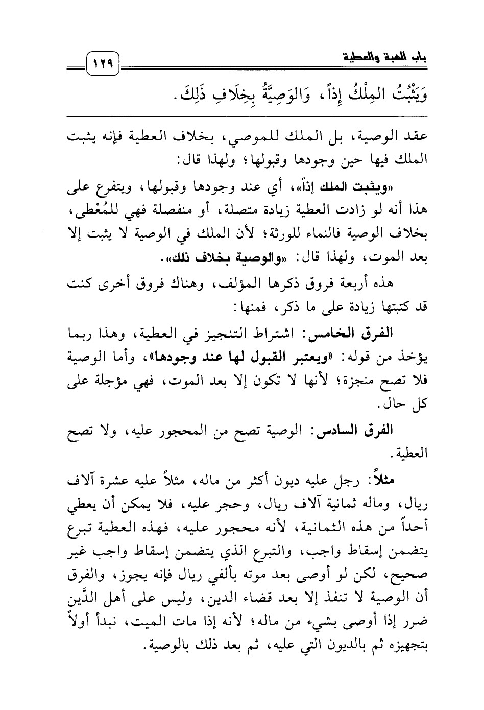 «ويثبت الملك إذاً»، أي عند وجودها وقبولها، ويت+فرع على هذا أنه لو زادت العطية زيادة متصلة، أو منفصلة فهي للمُعْطى، بخلاف الوصية فالنماء للورثة؛ لأن الملك في الوصية لا يثبت إلا بعد الموت، ولهذا قال: «والوصية بخلاف ذلك».