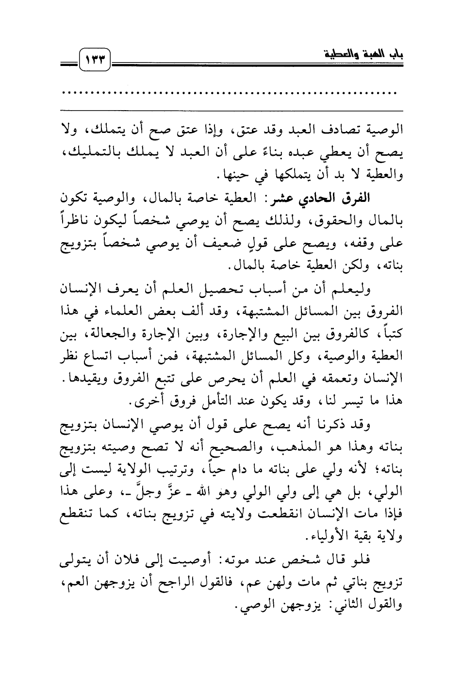 وليعلم أن من أسباب تحصيل العلم أن يعرف الإنسان الفروق بين المسائل المشتبهة، وقد ألف بعض العلماء في هذا كتباً، كالفروق بين البيع والإجارة، وبين الإجارة والجعالة، بين العطية والوصية، وكل المسائل المشتبهة، فمن أسباب اتساع نظر الإنسان وتعمقه في العلم أن يحرص على تتبع الفروق ويقيدها. هذا ما تيسر لنا، وقد يكون عند التأمل فروق أخرى.
