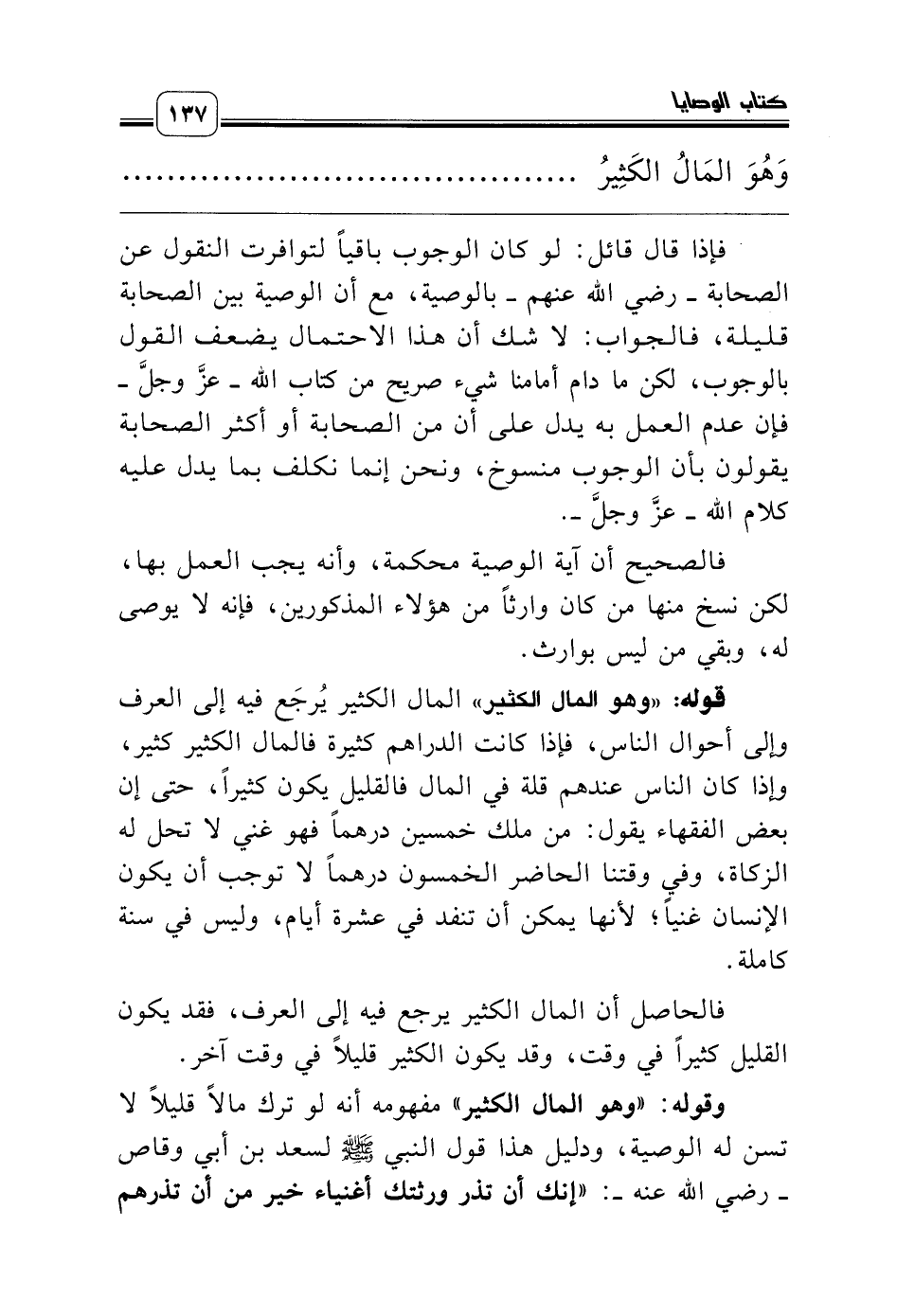 وقوله: «وهو المال الكثير» مفهومه أنه لو ترك مالاً قليلاً لا تسن له الوصية، ودليل هذا قول النبي صلّى الله عليه وسلّم لسعد بن أبي وقاص ـ رضي الله عنه ـ: «إنك أن تذر ورثتك أغنياء خير من أن تذرهم