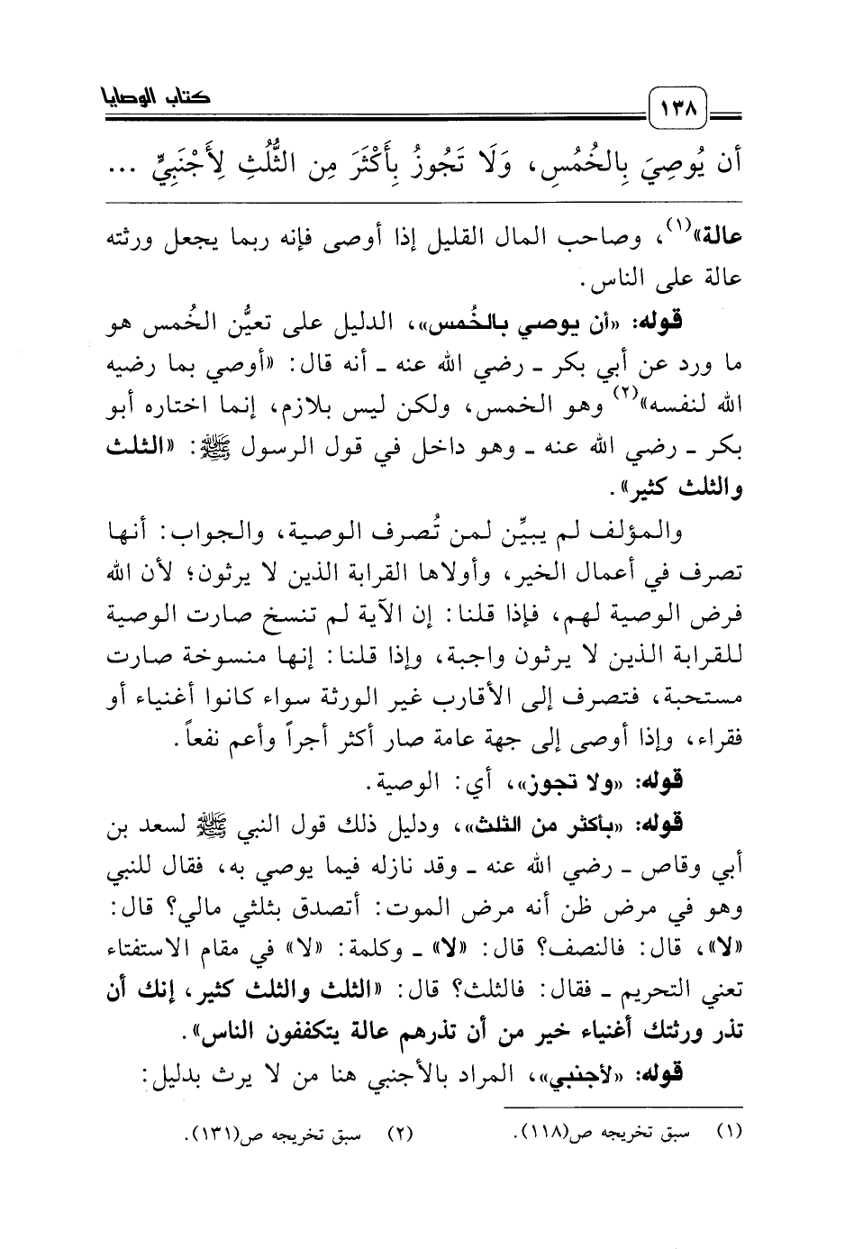 قوله: «أن يوصي بالخُمس»، الدليل على تعيُّن الخُمس هو ما ورد عن أبي بكر ـ رضي الله عنه ـ أنه قال: «أوصي بما رضيه الله لنفسه» (¬2) وهو الخمس، ولكن ليس بلازم، إنما اختاره أبو بكر ـ رضي الله عنه ـ وهو داخل في قول الرسول صلّى الله عليه وسلّم: «الثلث والثلث كثير».