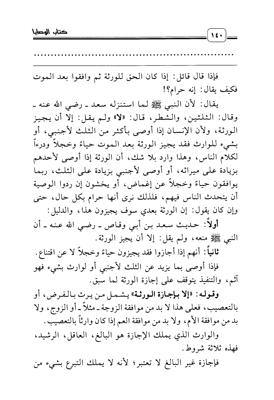 أولاً: حديث سعد بن أبي وقاص ـ رضي الله عنه ـ أن النبي صلّى الله عليه وسلّم منعه، ولم يقل: إلا أن يجيز الورثة.