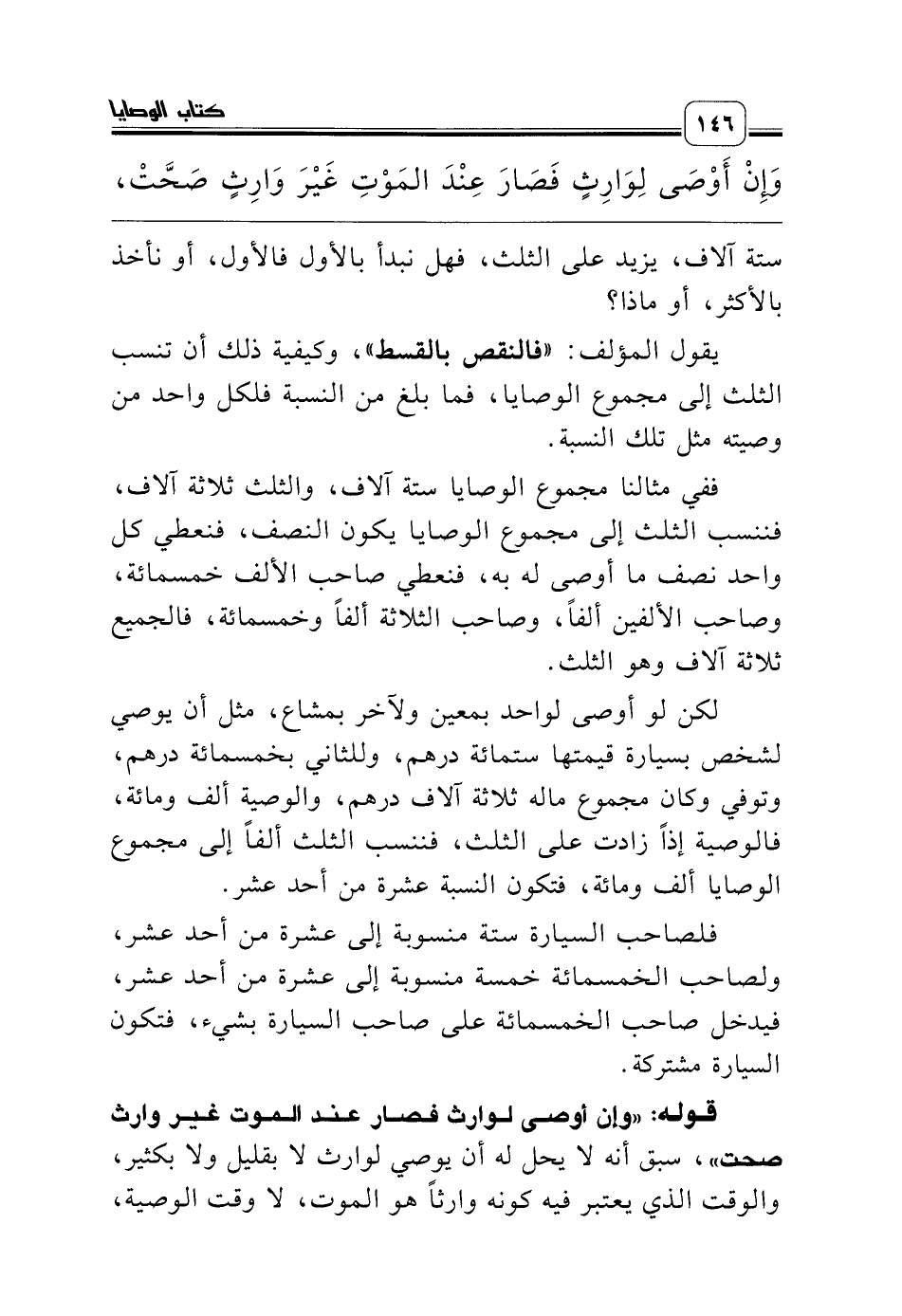 ستة آلاف، والثلث ثلاثة آلاف، فننسب الثلث إلى مجموع الوصايا يكون النصف، فنعطي كل واحد نصف ما أوصى له به، فنعطي صاحب الألف خمسمائة، وصاحب الألفين ألفاً، وصاحب الثلاثة ألفاً وخمسمائة، فالجميع ثلاثة آلاف وهو الثلث.