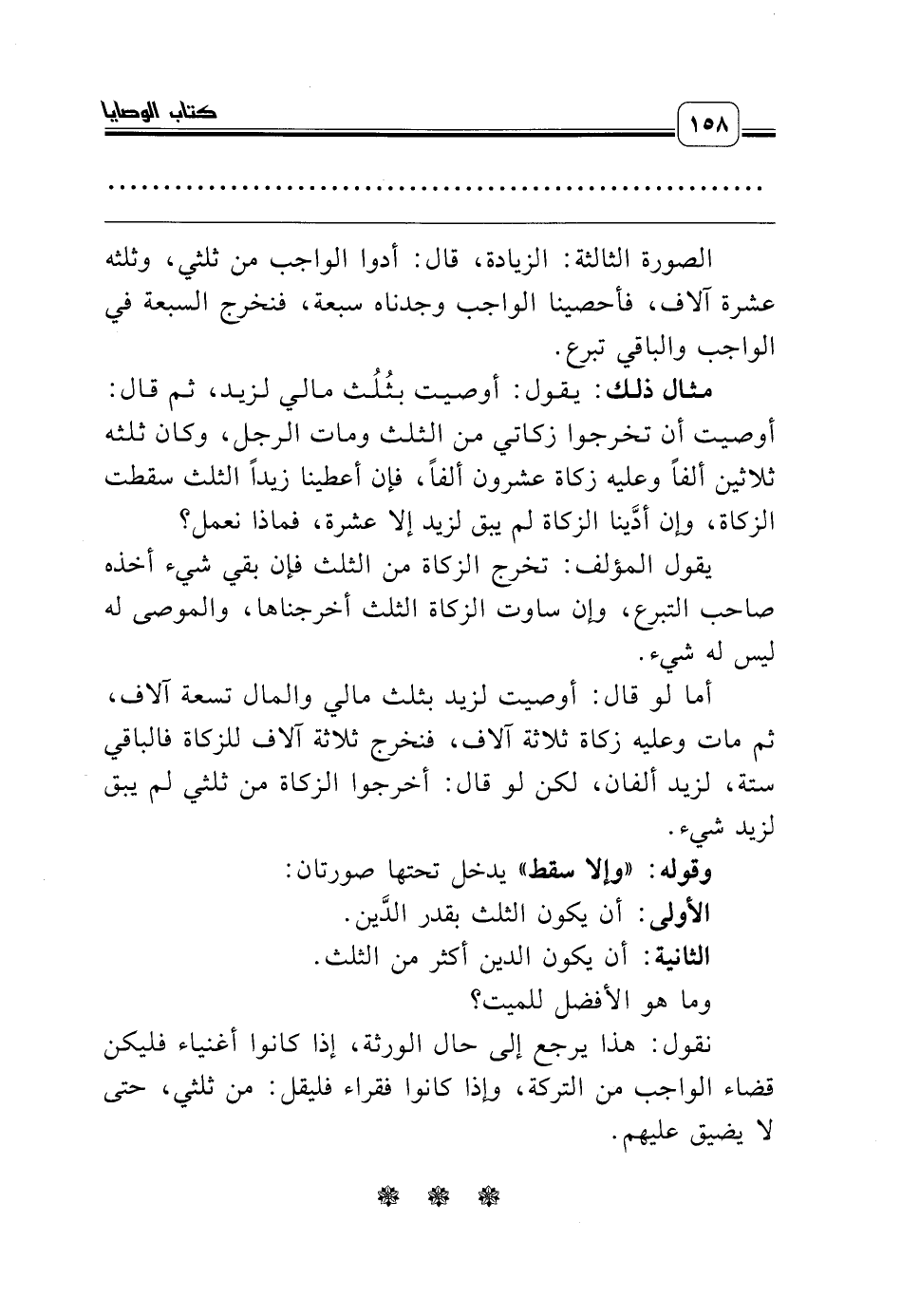 مثال ذلك: يقول: أوصيت بثُلُث مالي لزيد، ثم قال: أوصيت أن تخرجوا زكاتي من الثلث ومات الرجل، وكان ثلثه ثلاثين ألفاً وعليه زكاة عشرون ألفاً، فإن أعطينا زيداً الثلث سقطت الزكاة، وإن أدَّينا الزكاة لم يبق لزيد إلا عشرة، فماذا نعمل؟