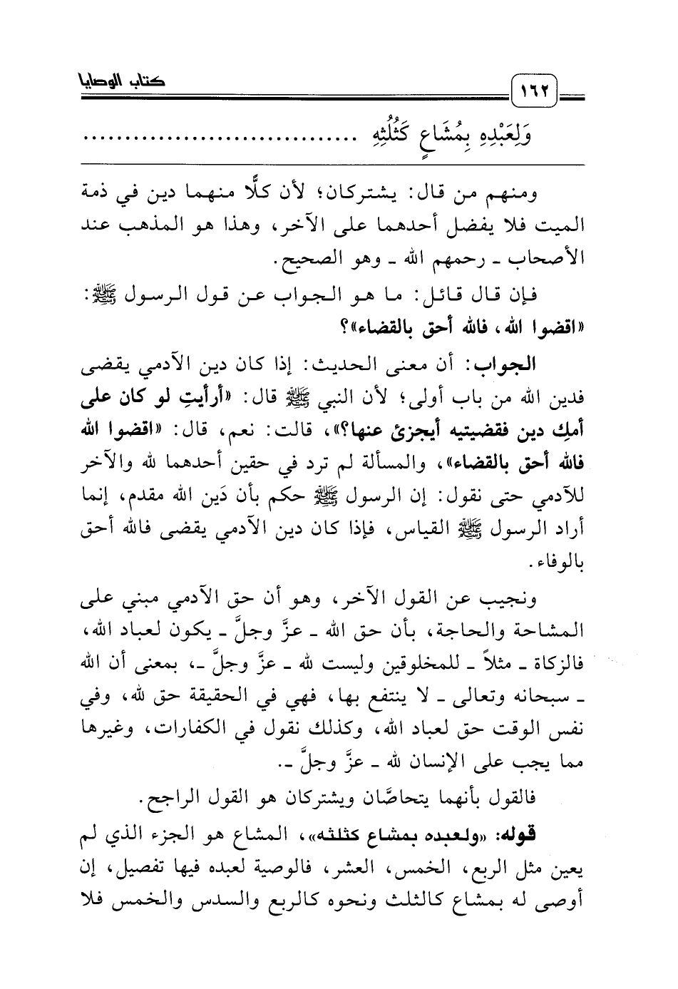 فإن قال قائل: ما هو الجواب عن قول الرسول صلّى الله عليه وسلّم: «اقضوا الله، فالله أحق بالقضاء»؟