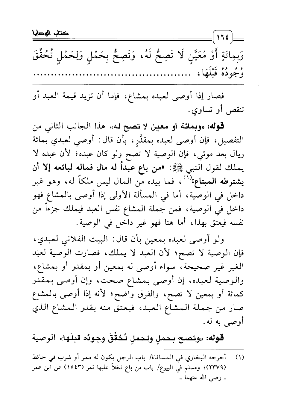 قوله: «وبمائة أو معين لا تصح له» هذا الجانب الثاني من التفصيل، فإن أوصى لعبده بمقدَّرٍ، بأن قال: أوصي لعبدي بمائة ريال بعد موتي، فإن الوصية لا تصح ولو كان عبده؛ لأن عبده لا يملك لقول النبي صلّى الله عليه وسلّم: «من باع عبداً له مال فماله لبائعه إلا أن يشترطه المبتاع» (¬1)، فما بيده من المال ليس ملكاً له، وهو غير داخل في الوصية، أما في المسألة الأولى إذا أوصى بالمشاع فهو داخل في الوصية، فمن جملة المشاع نفس العبد فيملك جزءاً من نفسه فيعتق بهذا، أما هنا فهو غير داخل في الوصية.